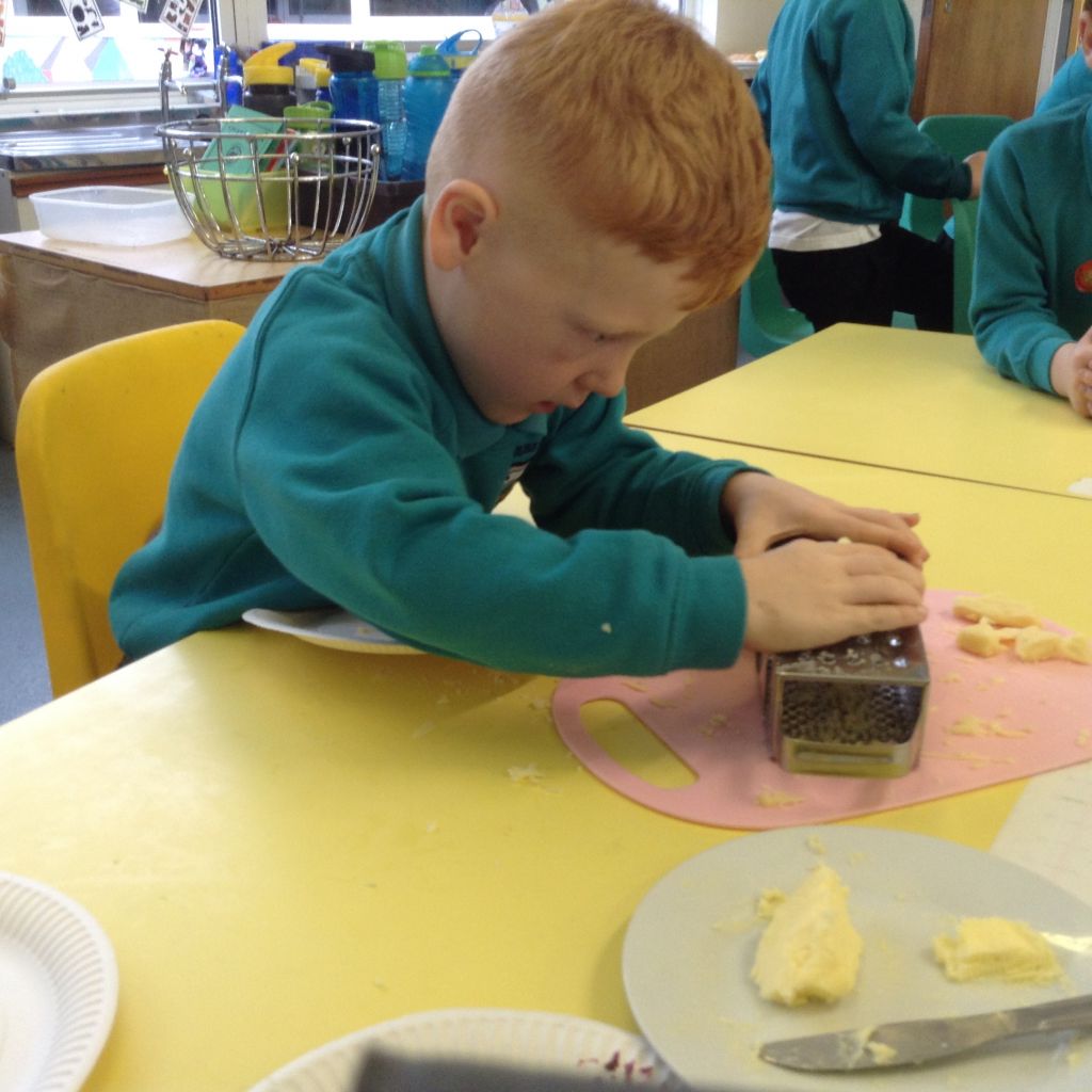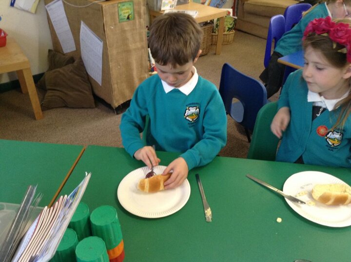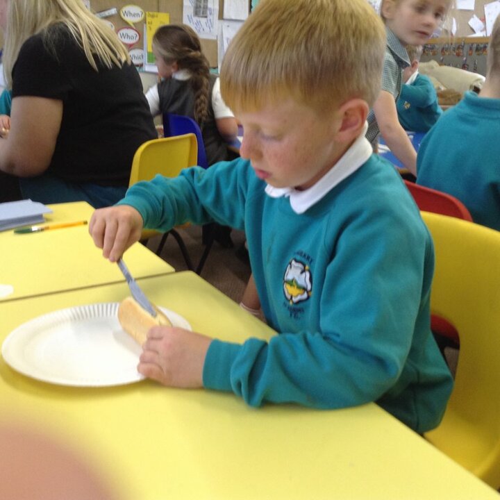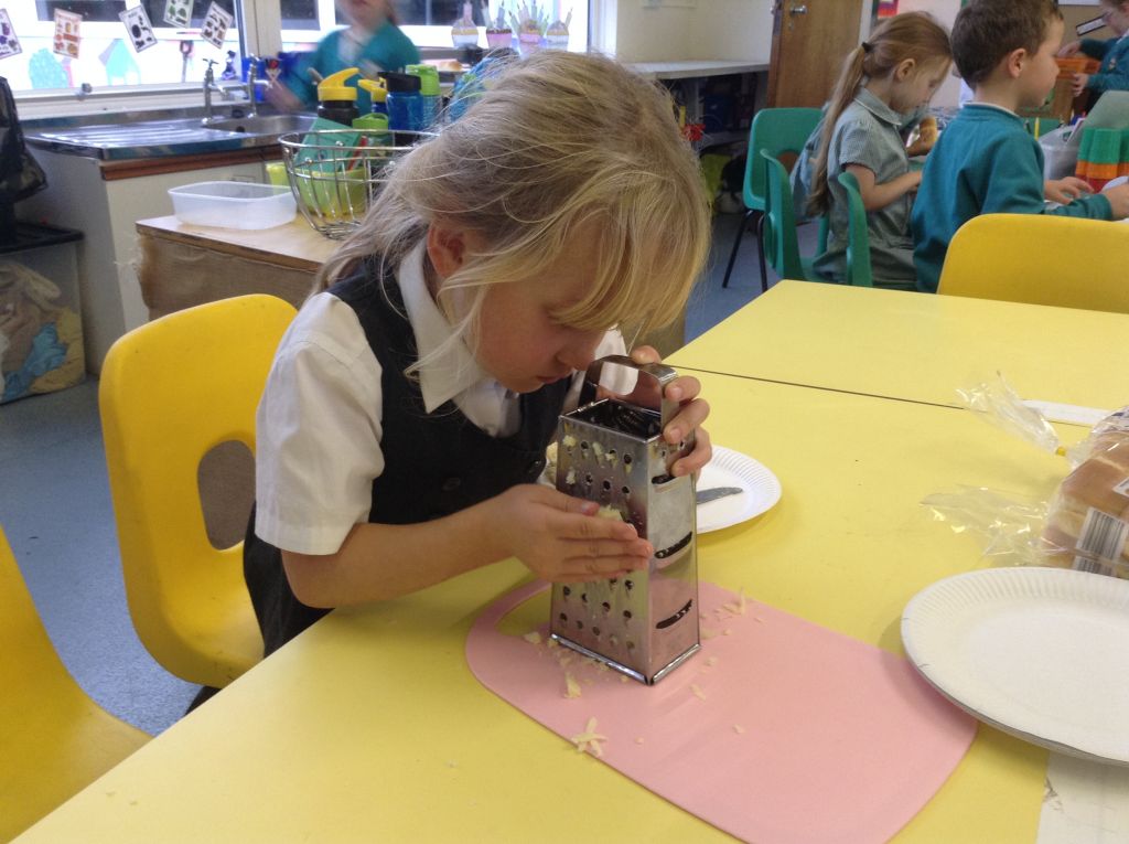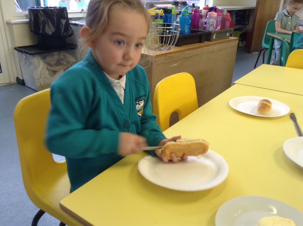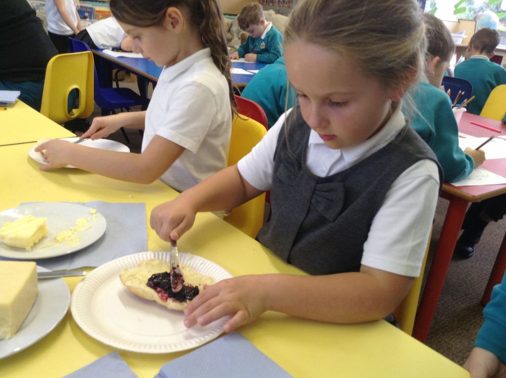 The children were able to cut open their bread rolls, spread the butter and jam or grate the cheese.