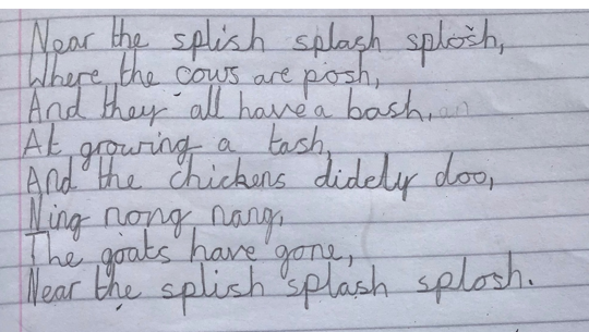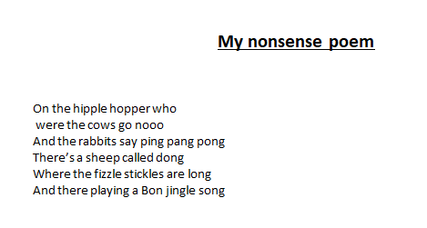 2 July 2020 Mrs Charlton Miss Harmar's Class 2019-2020 The children have been busy learning all about poetry this week and I have thoroughly enjoyed reading and watching Miss Harmar's class perform their poetry. Here is just a taster of some of the brilliant work the children have done. Nonsense poems Nonsense Poems