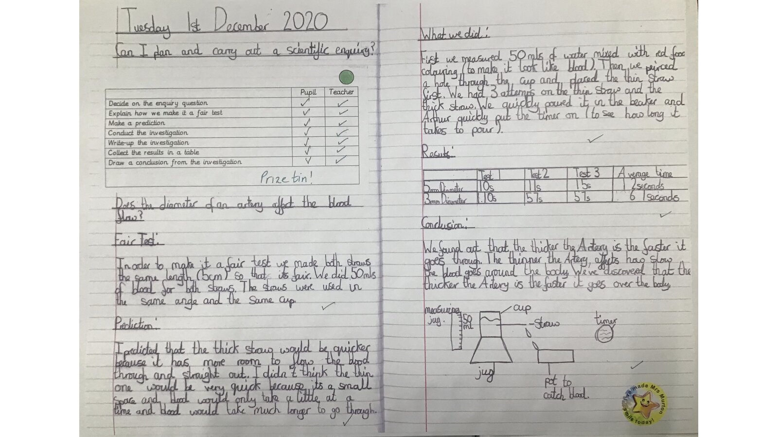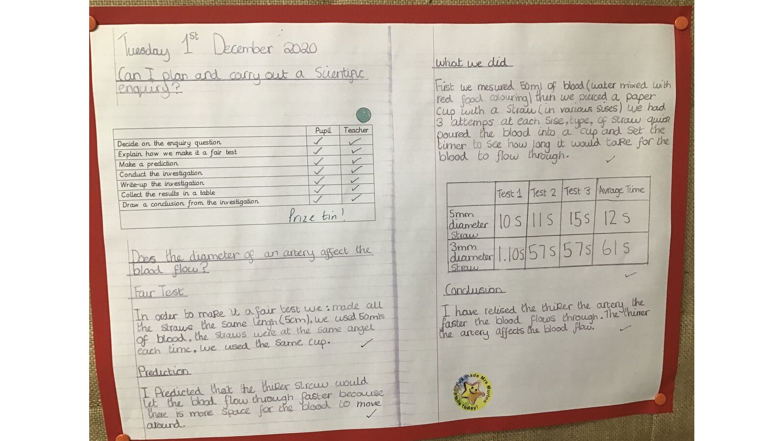 This week we carried out a fair test into blood flow. We ensured everything was kept the same apart from the width of the straws that were representing the blood vessels. We found that blood flowed quicker through the wider vessel. We also discussed what would happen if the blood was thicker or thinner and also what could happen if there was a blockage which stopped the flow.