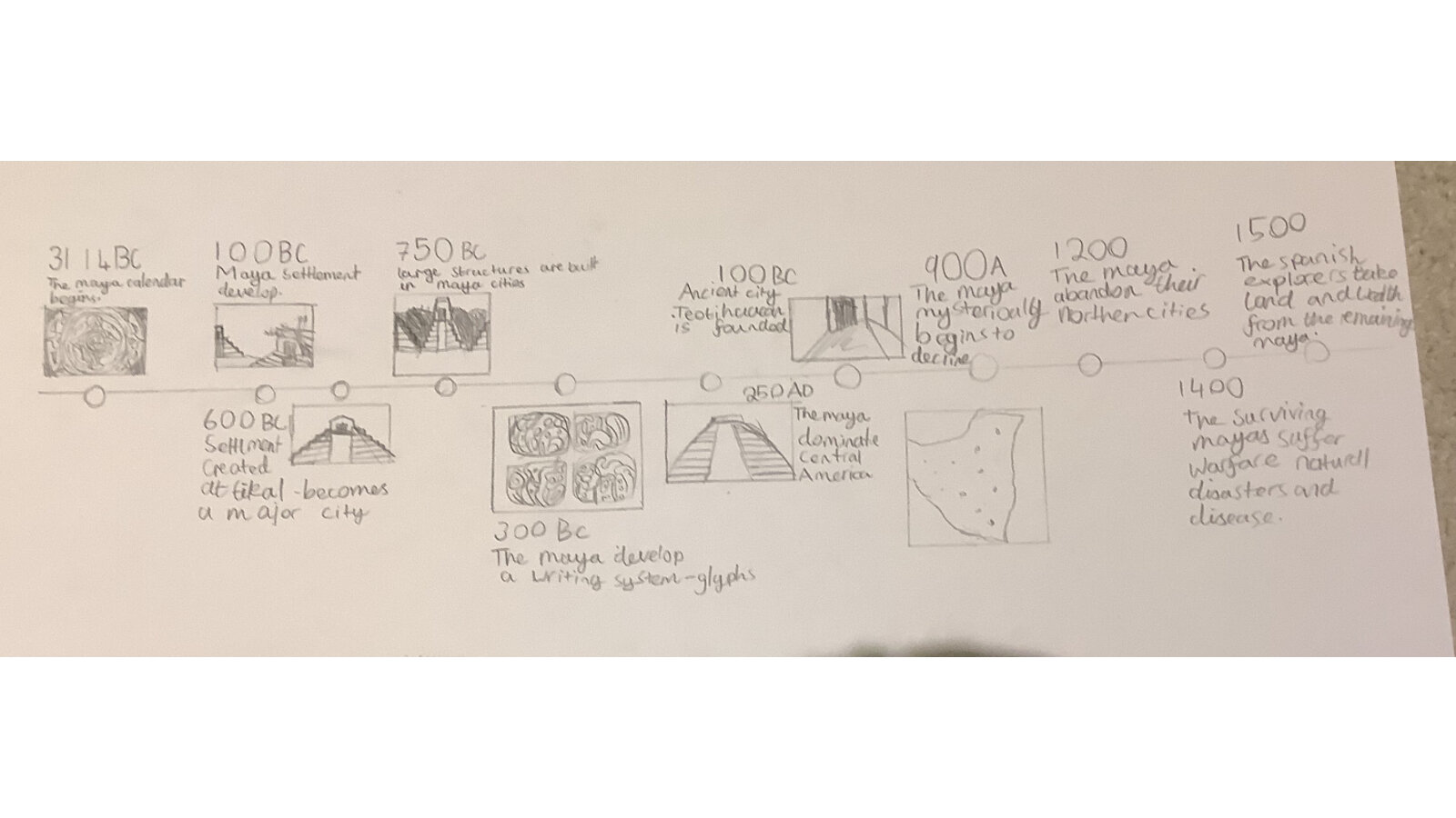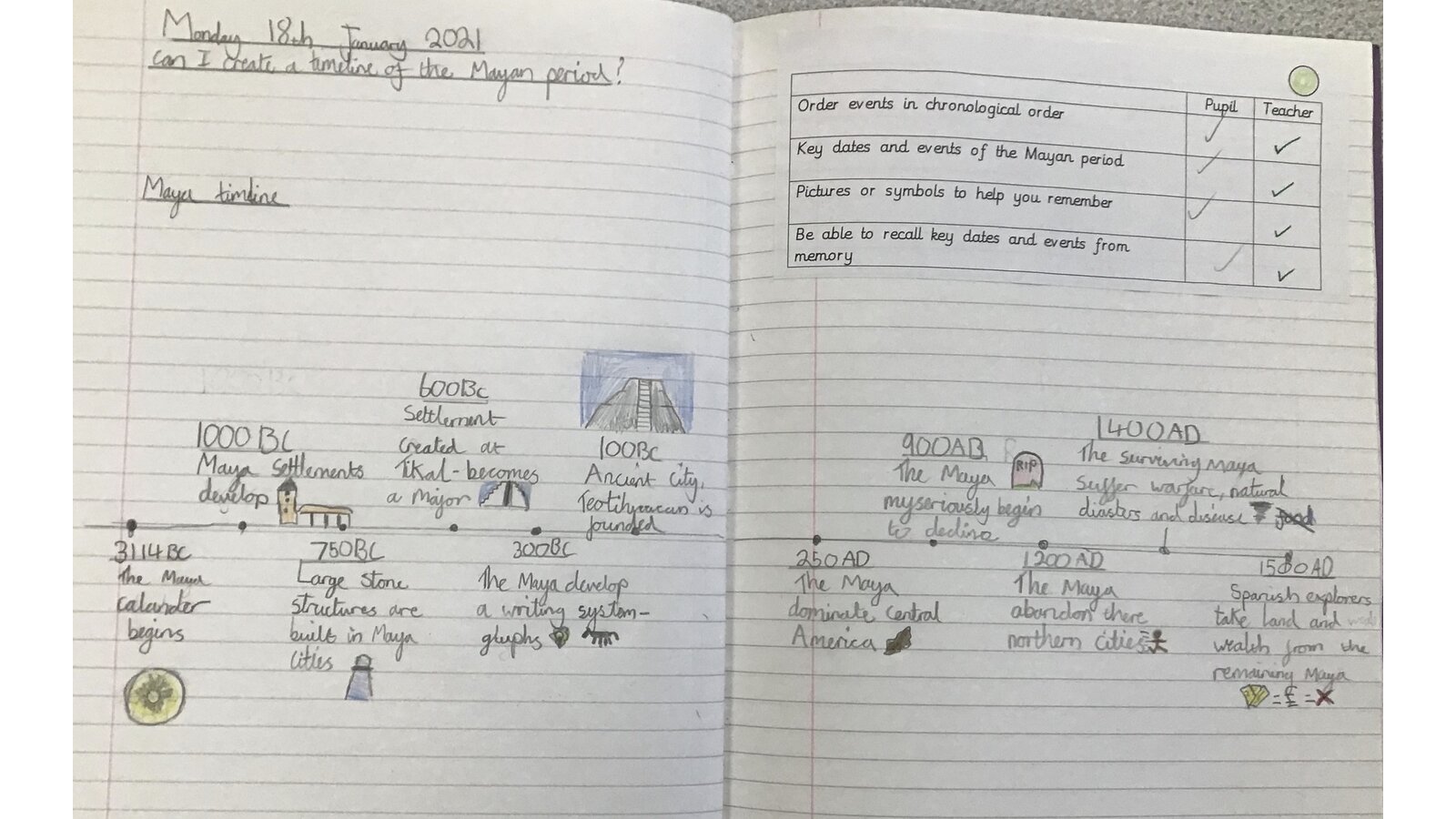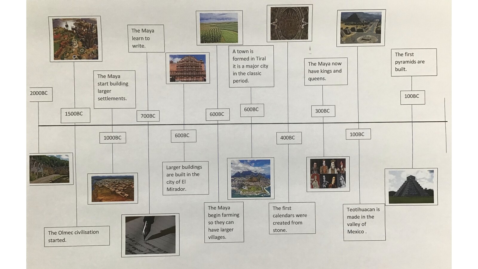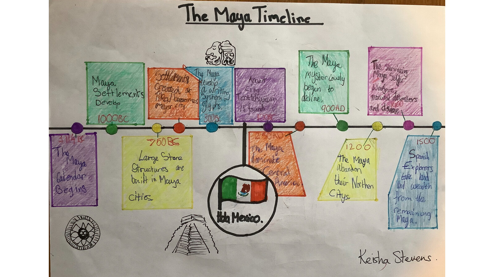 This week, we have been looking at the Maya and what happened during the Maya period. The children created timelines and used pictures in order to help them remember key dates and events. They then looked at Maya writing and recreated Maya glyphs using various media. This was great work both at home and school.