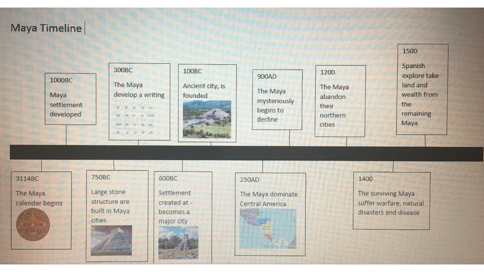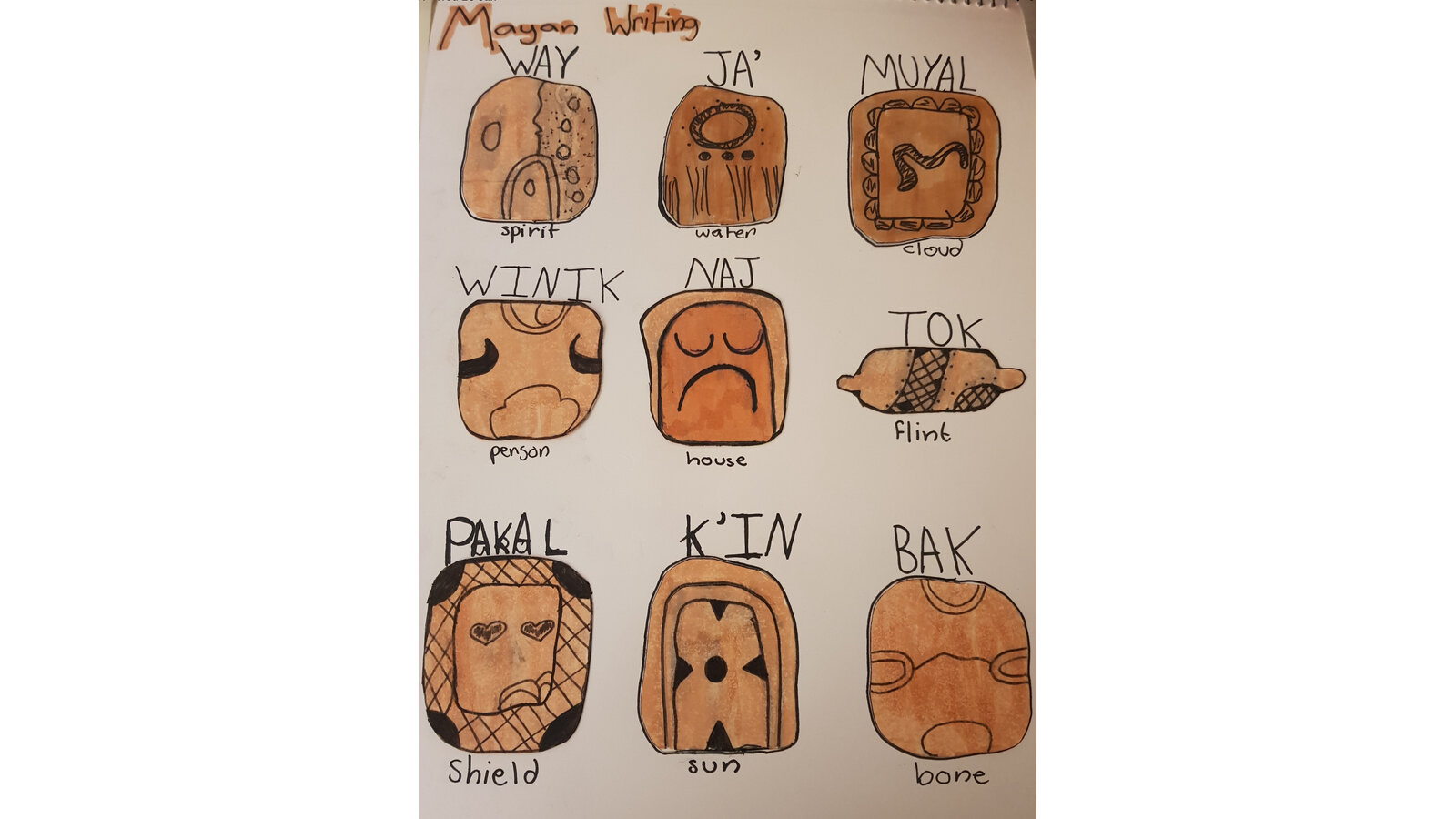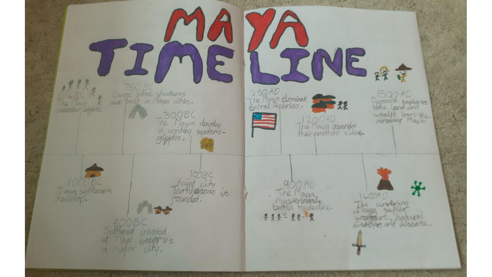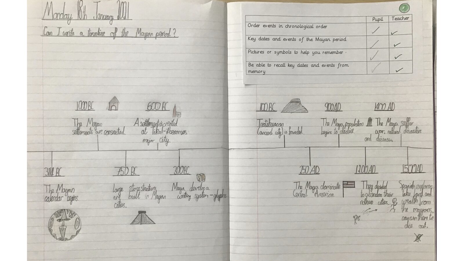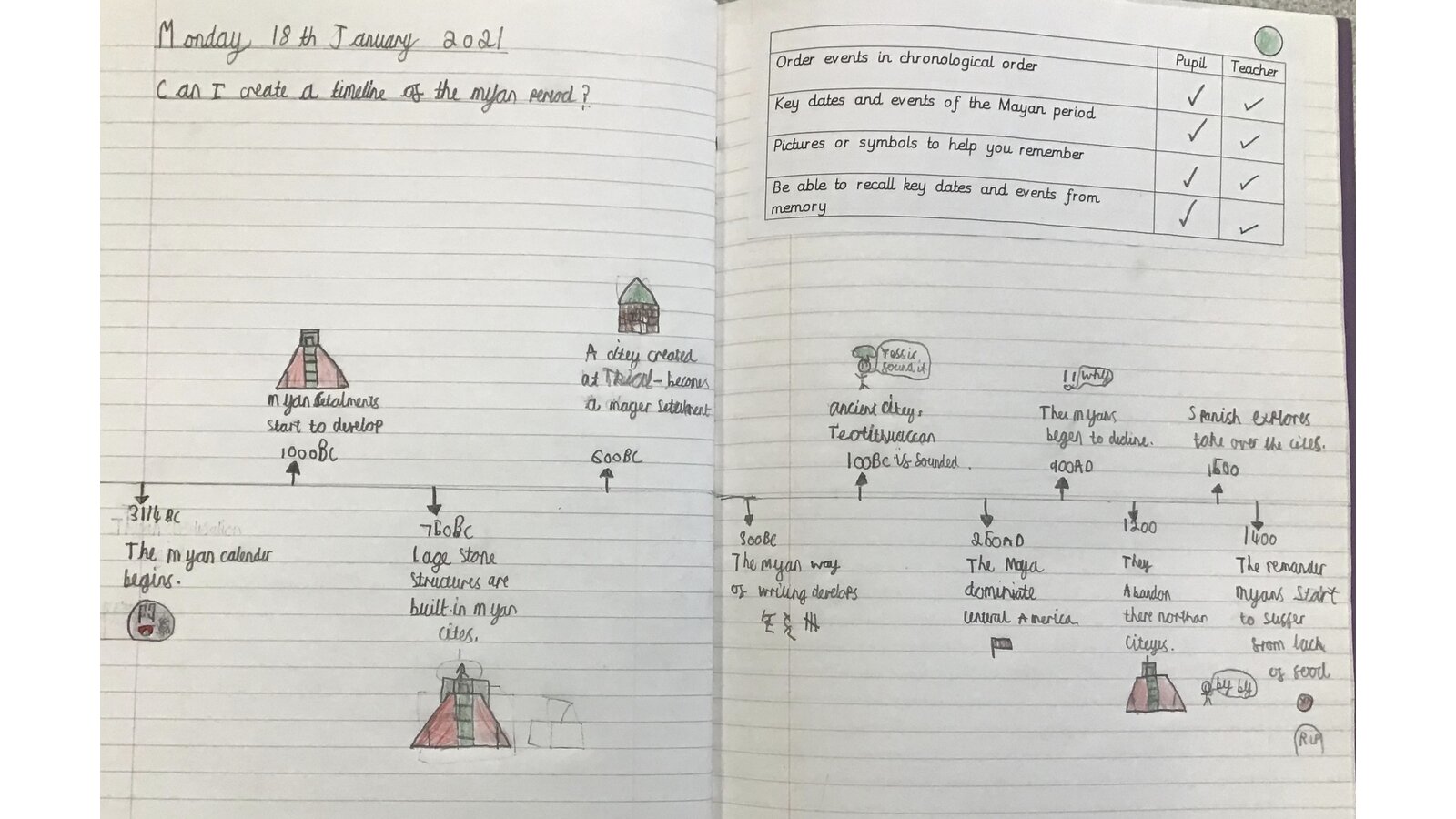This week, we have been looking at the Maya and what happened during the Maya period. The children created timelines and used pictures in order to help them remember key dates and events. They then looked at Maya writing and recreated Maya glyphs using various media. This was great work both at home and school.