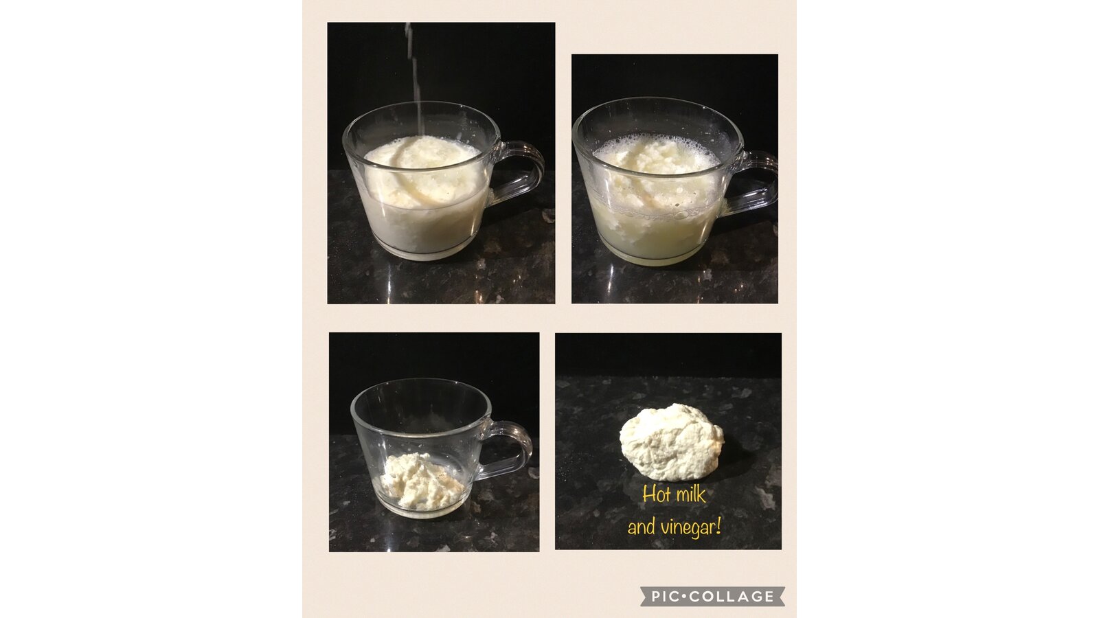 Finally, we warmed milk and added vinegar. This looked disgusting as the milk curdled!