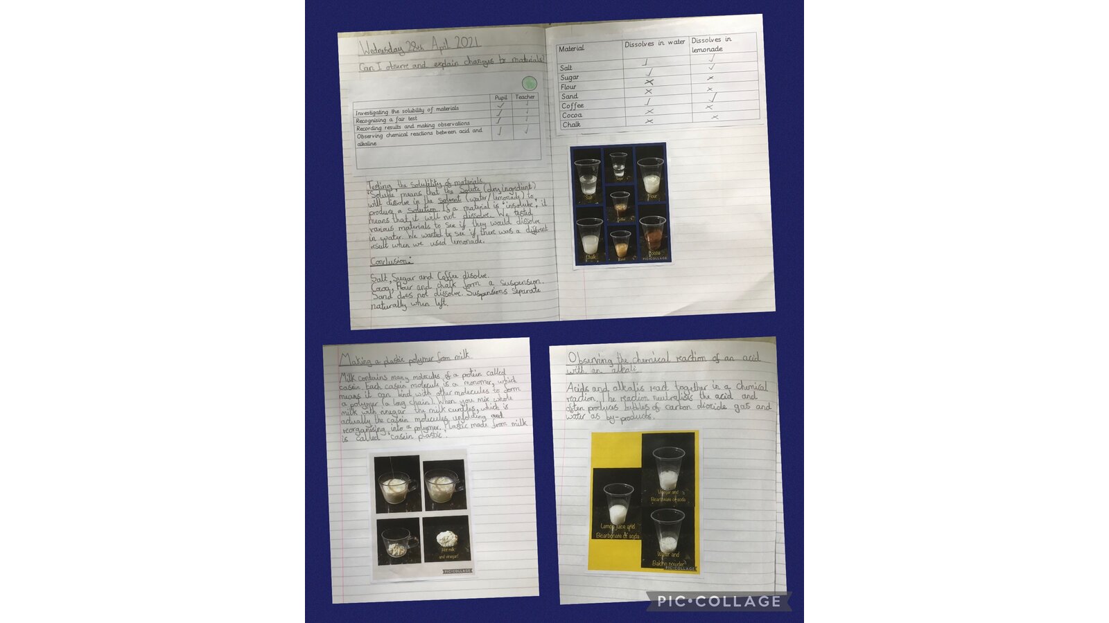 This week we have been investigating the solubility of materials. We talked about what this meant, how we could do this and fair testing. We tested the solubility of various materials in water and then lemonade to see if there were any differences.