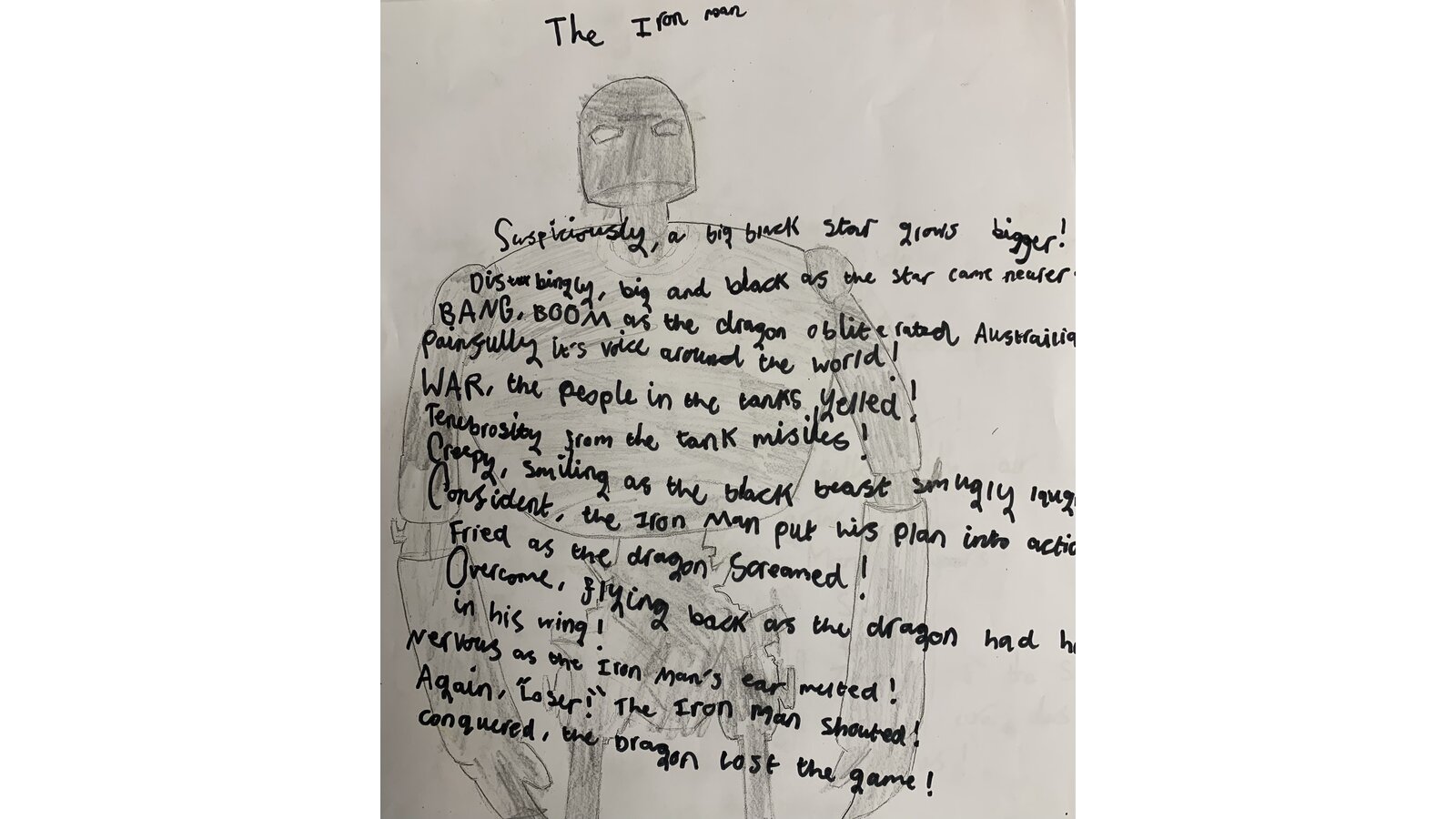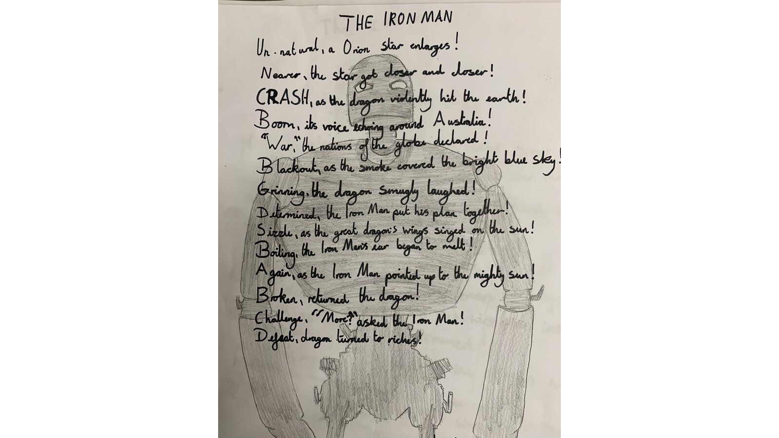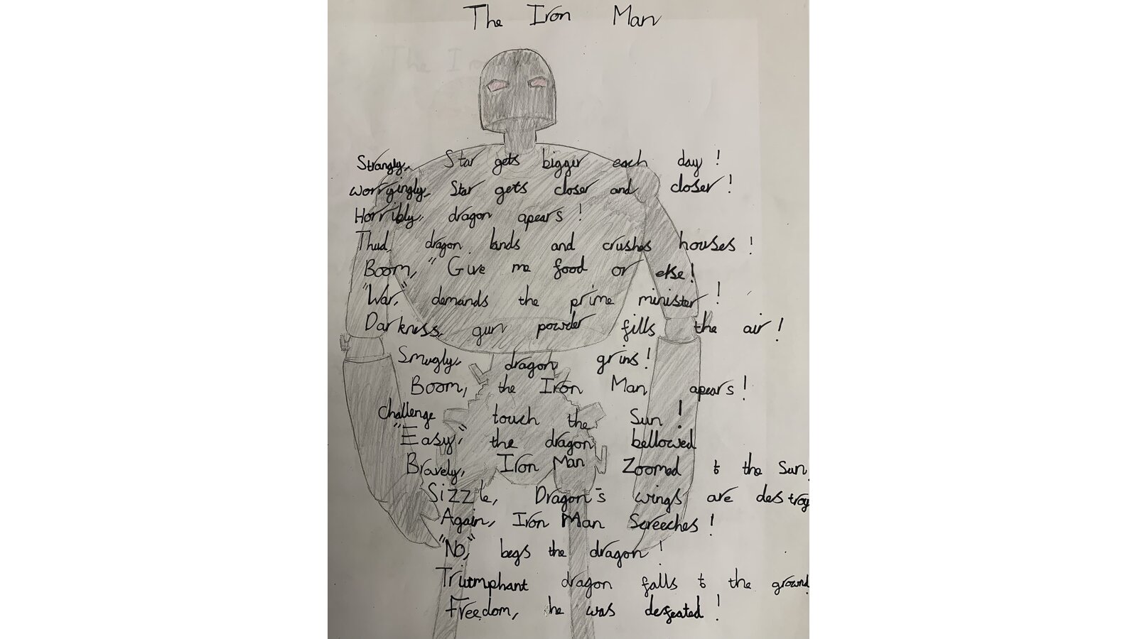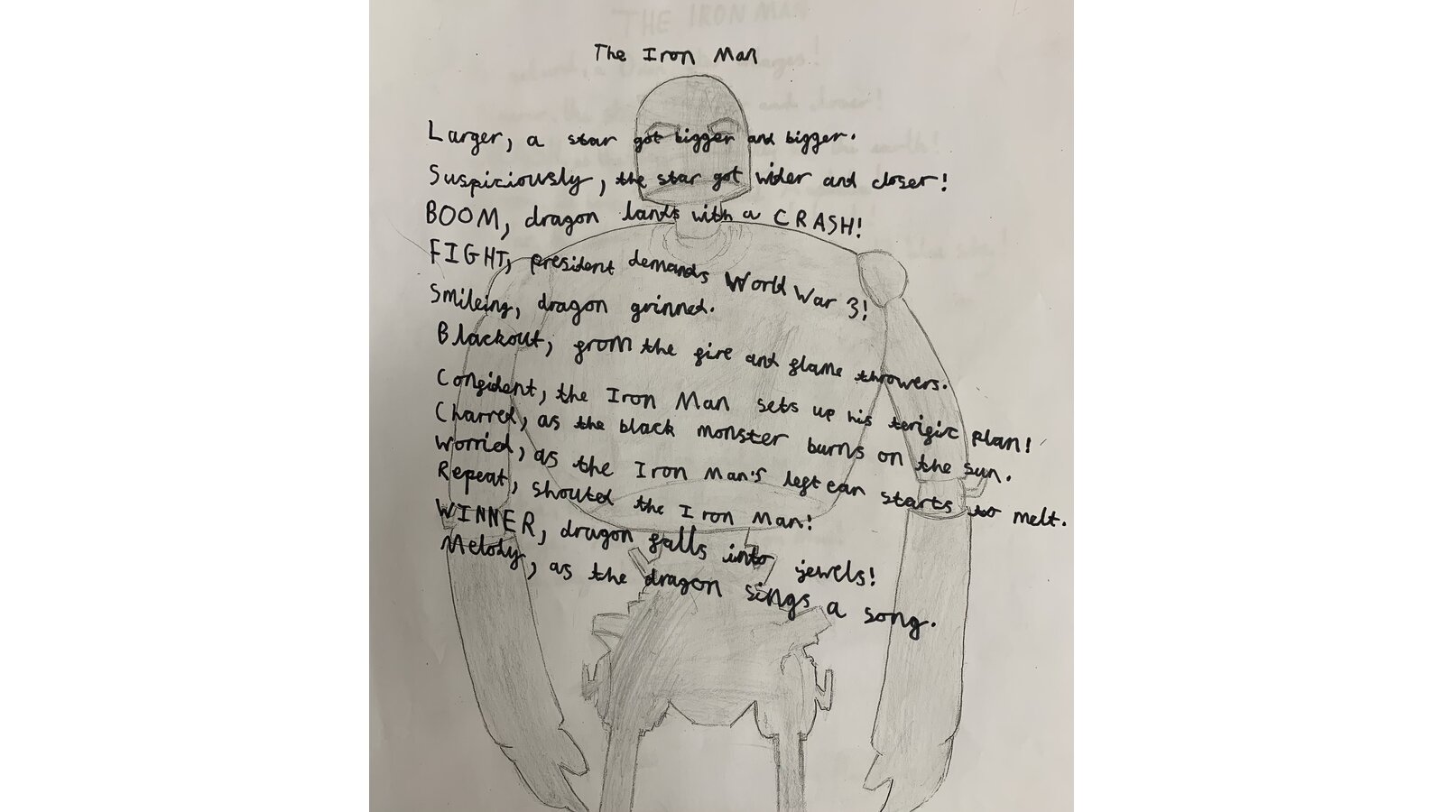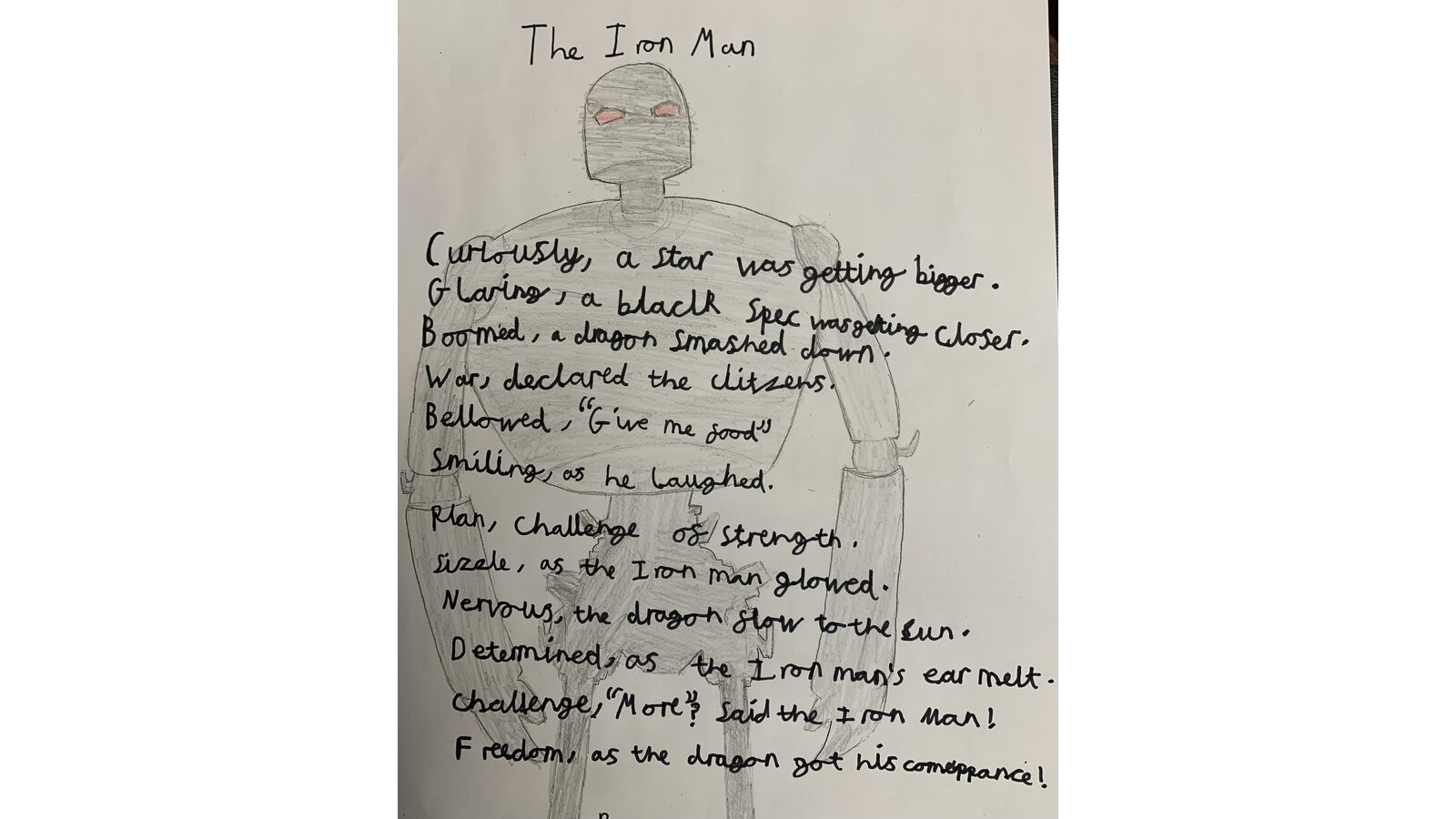 This half term we have been reading the Iron Man by Ted Hughes and thoroughly enjoyed it. This week we have looked at the use of language and structure of poems. Using the story as inspiration, the children have created their own list poems. Here are a few examples: