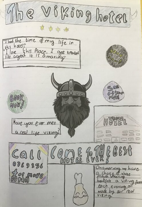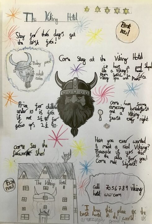 Another brilliant week writing and being creative with our topic. This week the children have been learning about the Viking Gods. We have all sketched the god Thor and used an application called charrepix to make an animation. We have also finished reading our book 'There is a Vinking in my bed!' which we thoroughly enjoyed. The children then created their own posters to advertise this very special hotel! Have a look at some of the classes' work below: