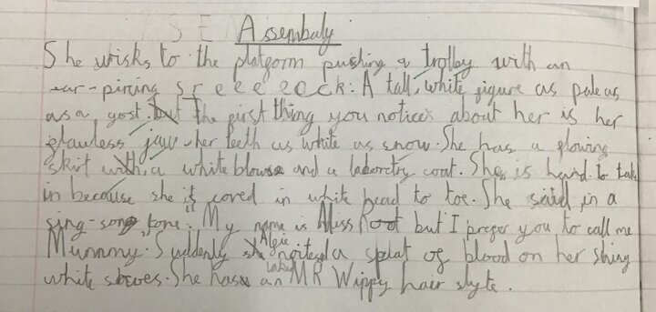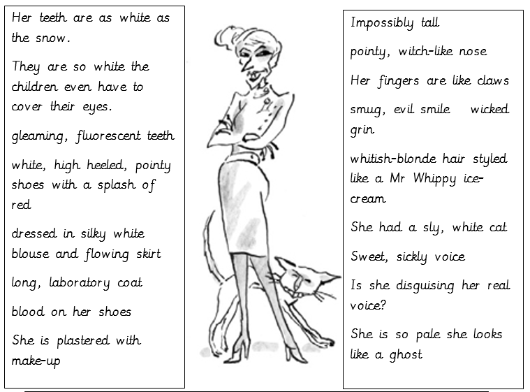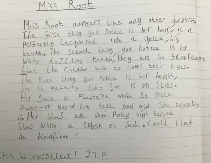 This week we have been introduced to the evil character of Miss Root in the book, "Demon Dentist" by David Walliams. The children have worked together to describe Miss Root, using expanded noun phrases. They have then produced their own wonderful descriptions, using these shared ideas. Well done, everyone!