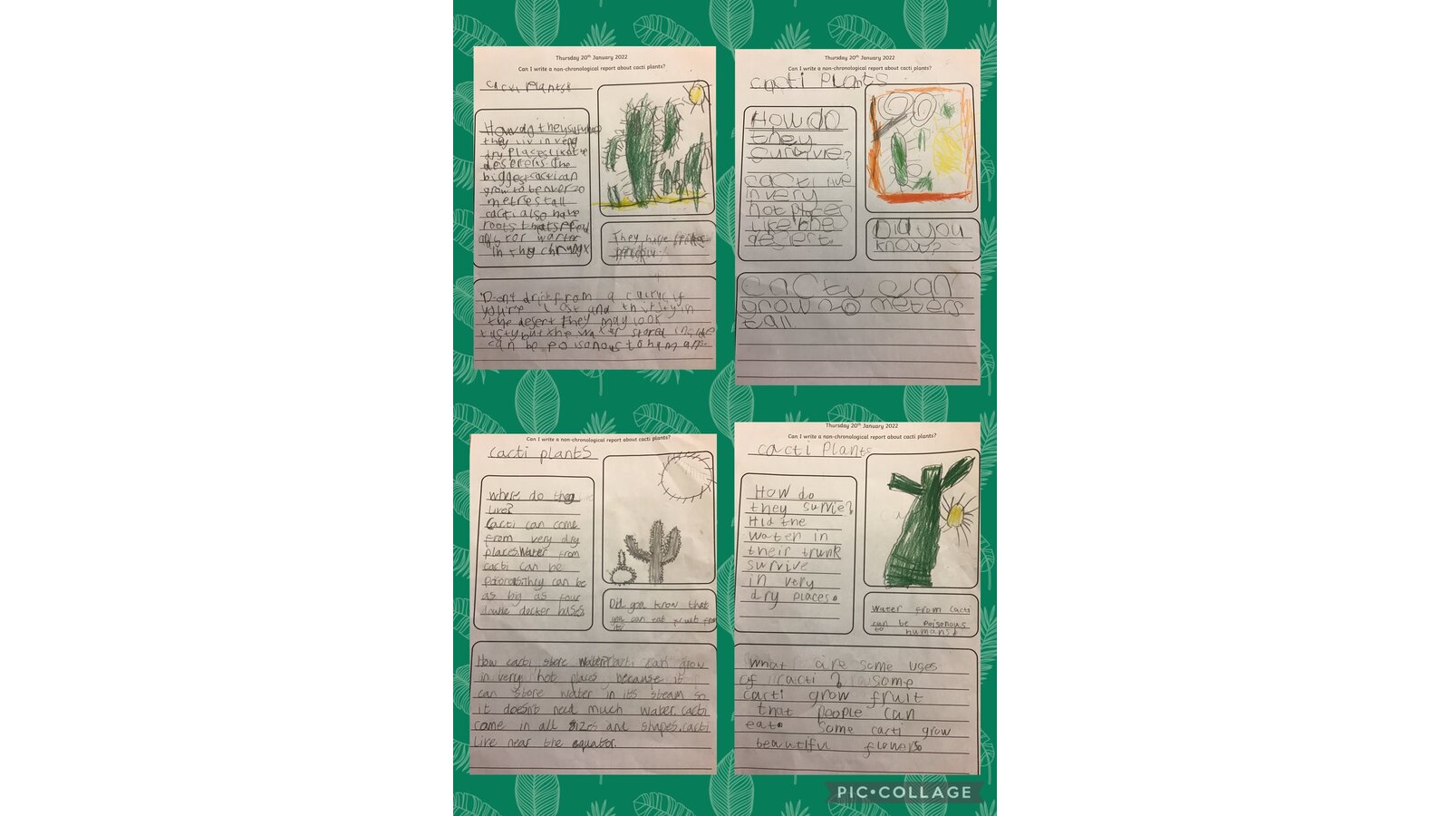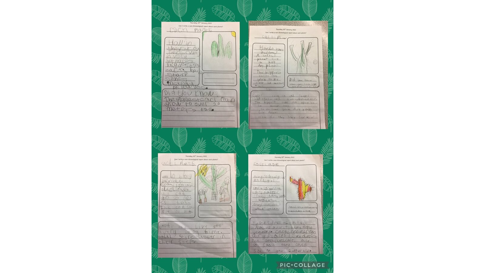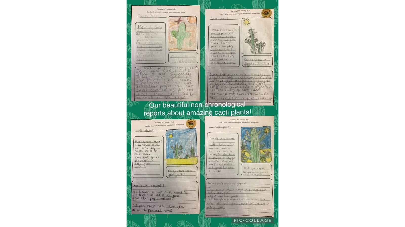 Here are our incredible non-chronological reports all about cacti plants. The children have thoroughly enjoyed using different sources to find out about these amazing plants which survive in extremely hot, dry places. We were amazed to discover that the biggest cacti plants can grow up to 20m tall and the smallest could sit on your fingertip! Well done Year 2, your reports are magnificent!