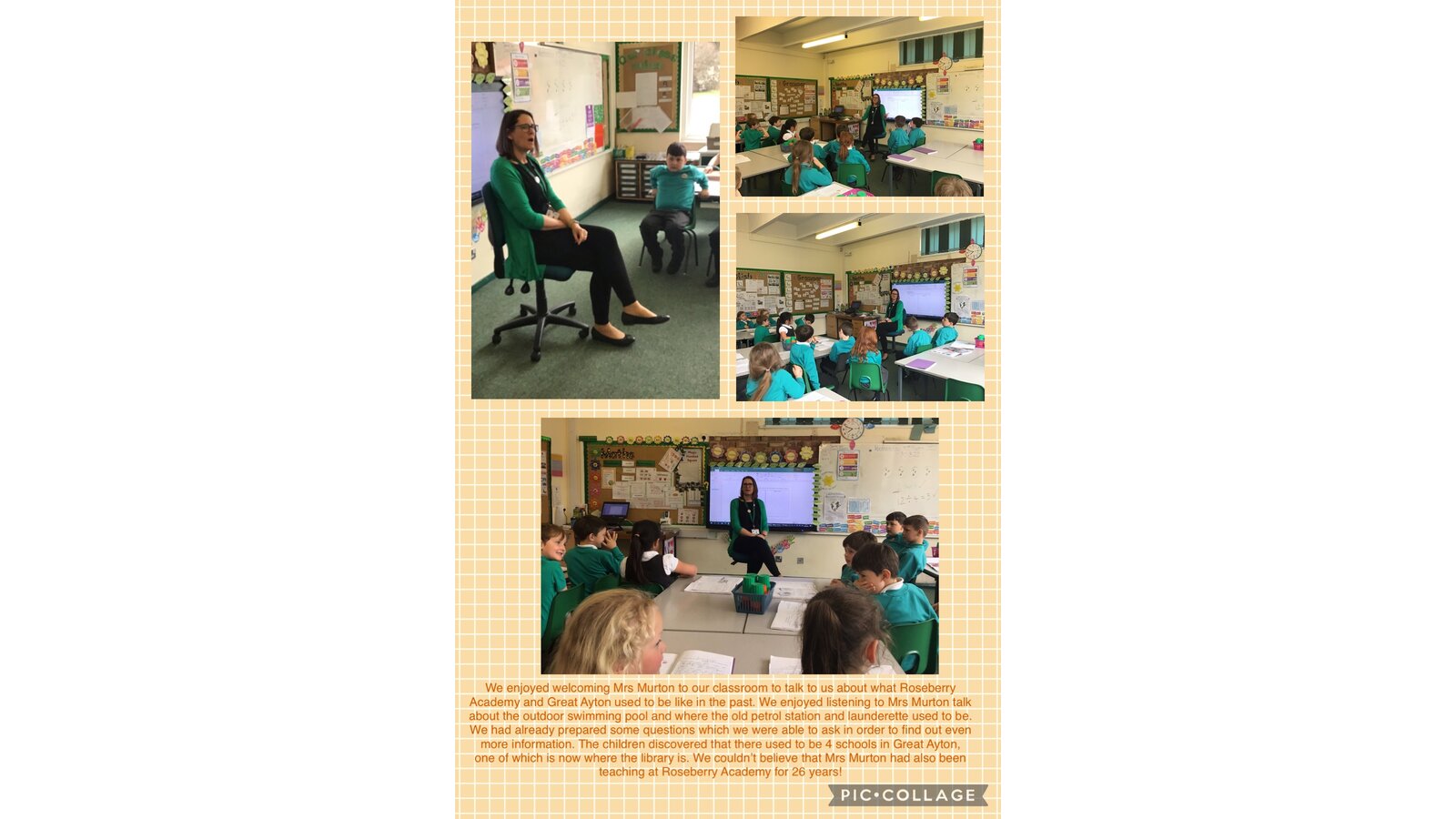 To find out more about Roseberry Academy, we welcomed Mrs Murton to talk to us about what the school and site was like when she first started teaching at the school. The children were amazed to discover that there used to be an outdoor swimming pool which the Year 6 children used to swim in!