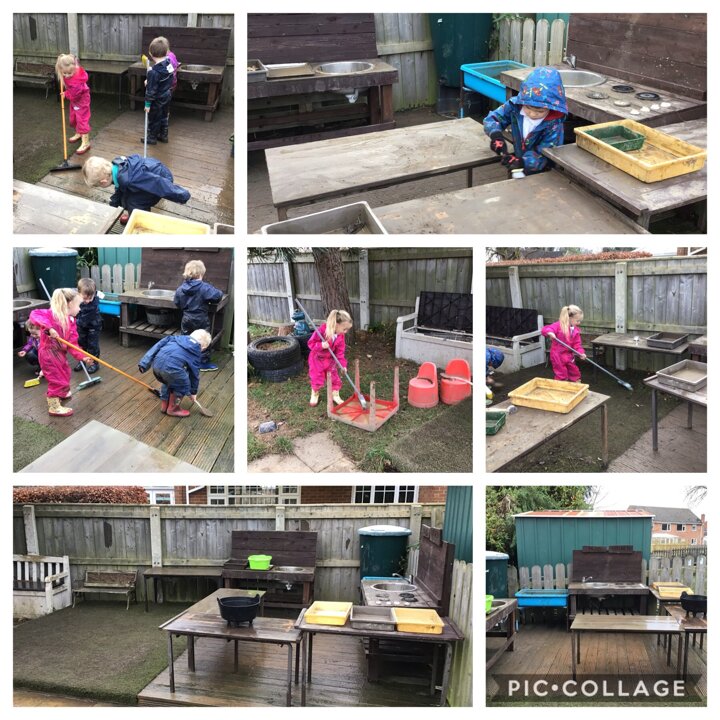 Teamwork to clean the Mud Kitchen