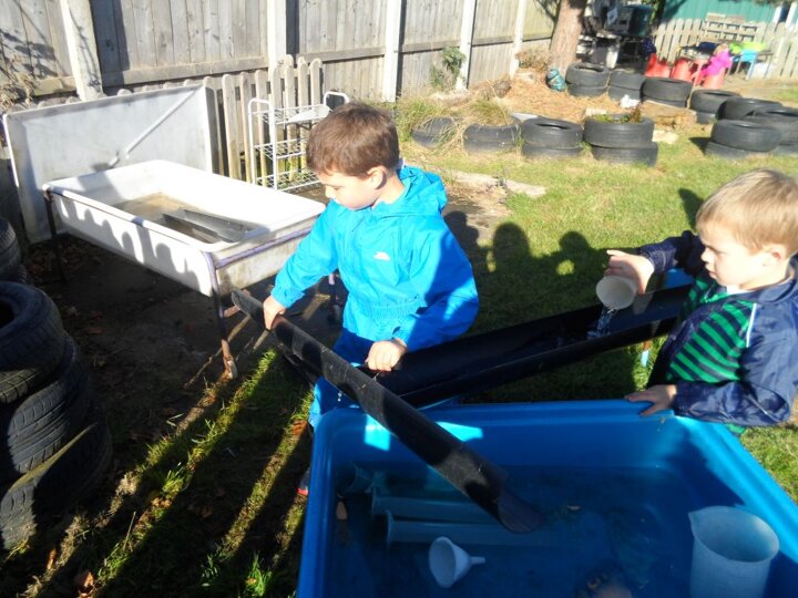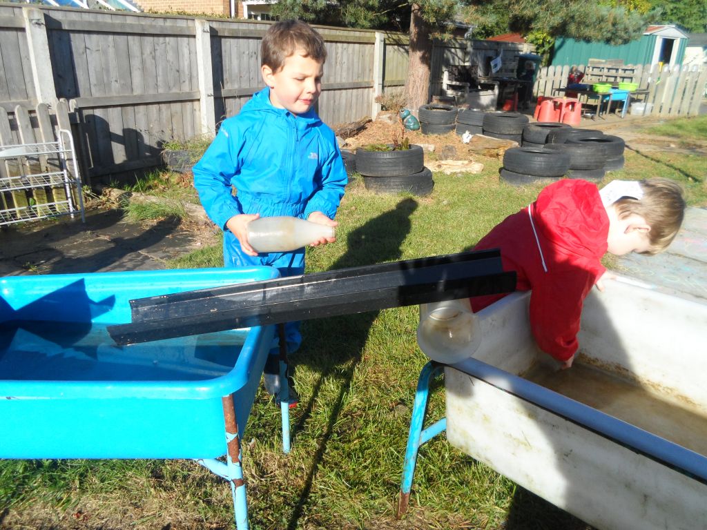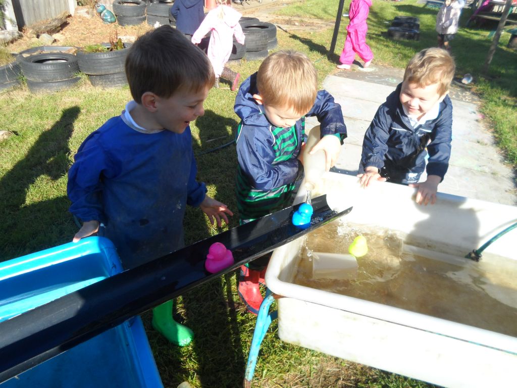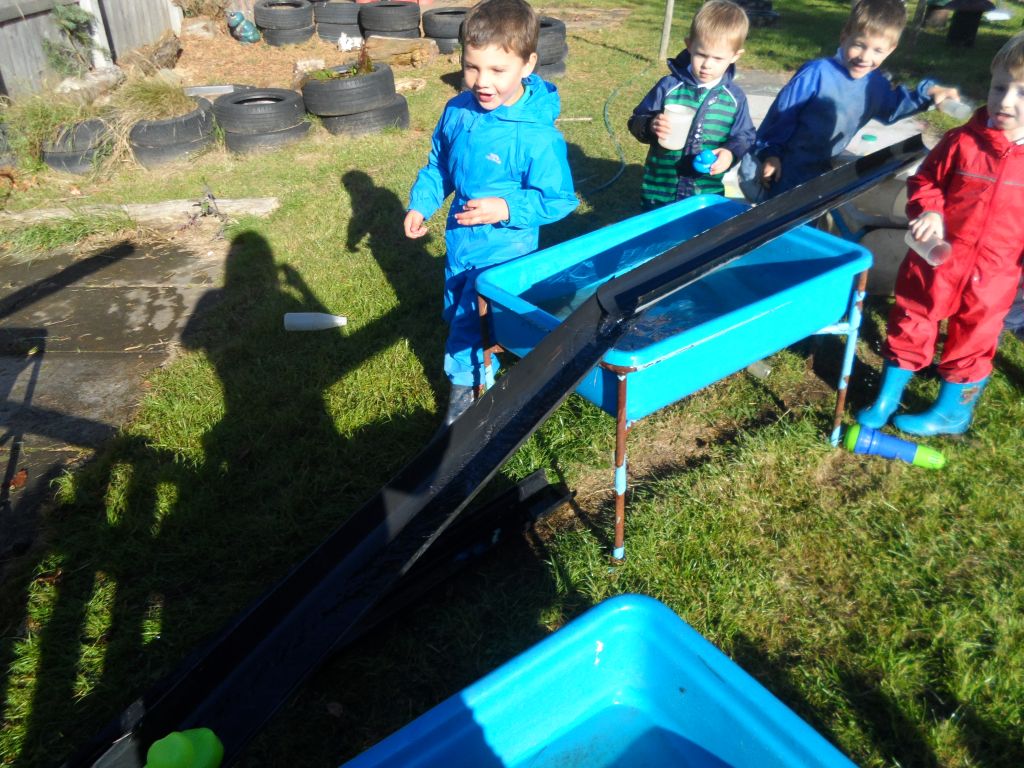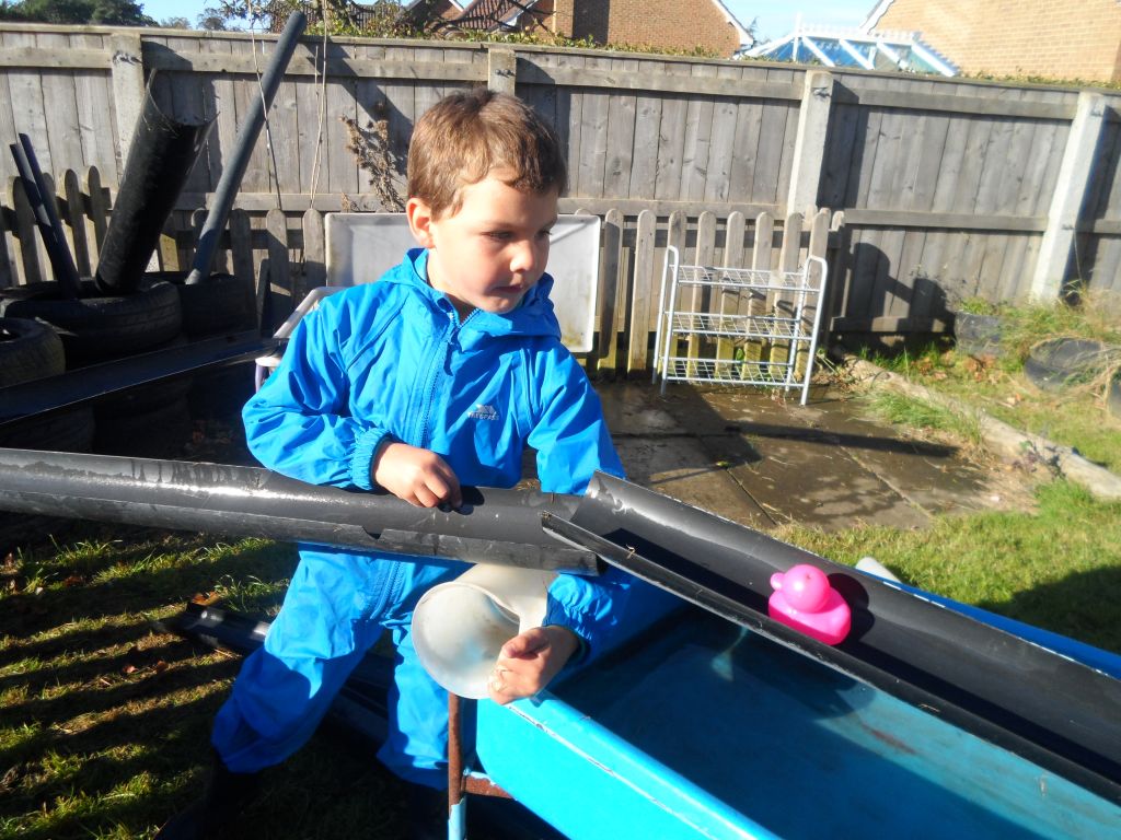 We had some really super thinking skills on display in our outdoor water area. We were trying to get the ducks from the top water tray all the way to the bottom water tray.