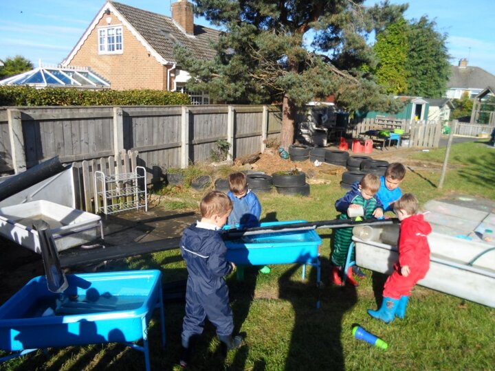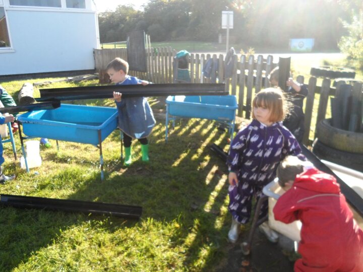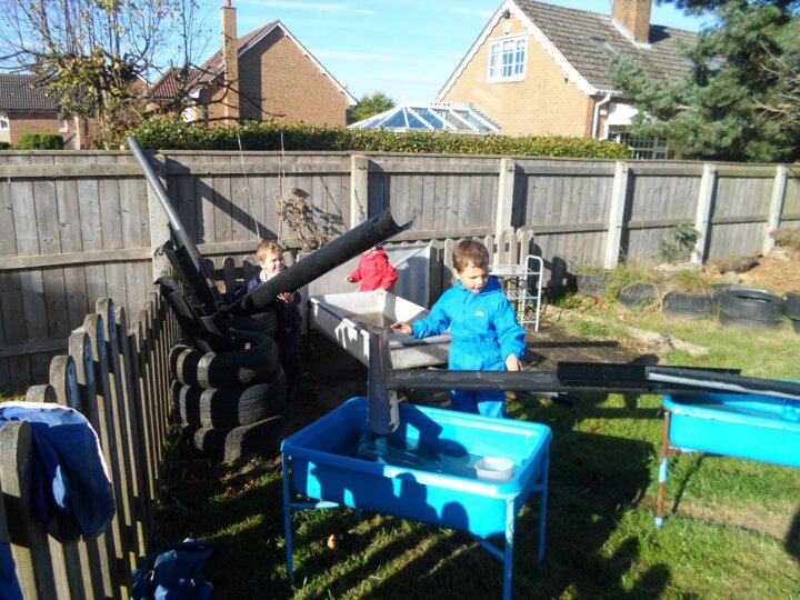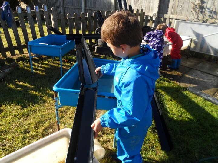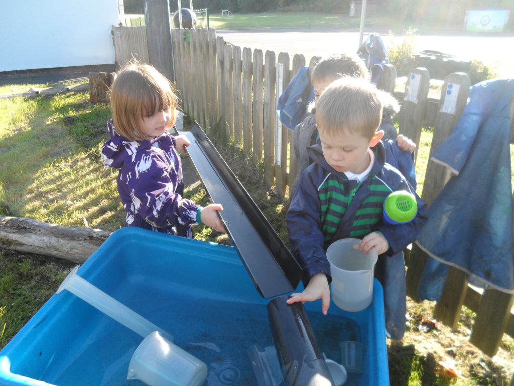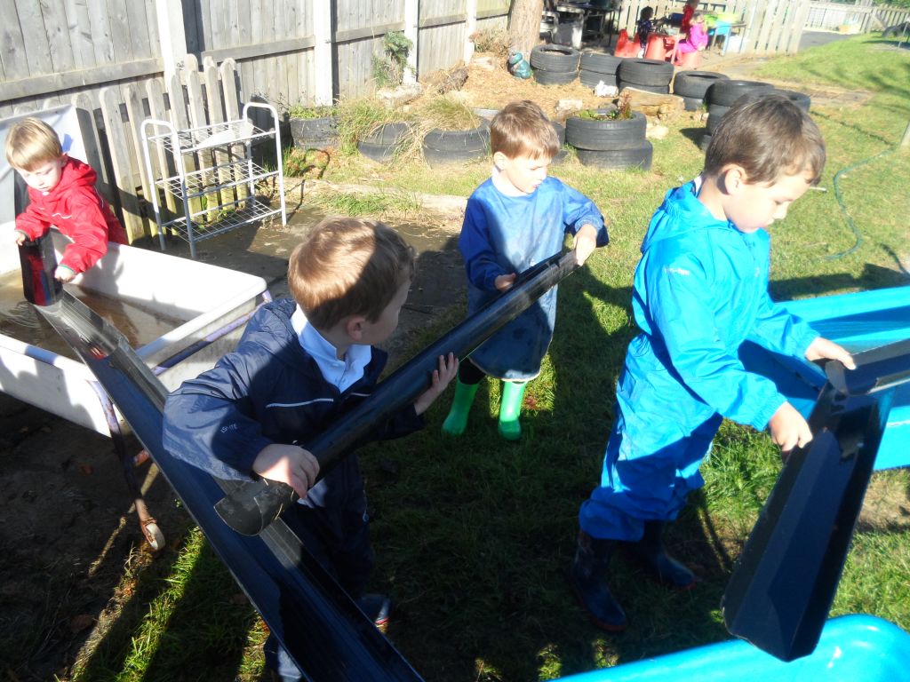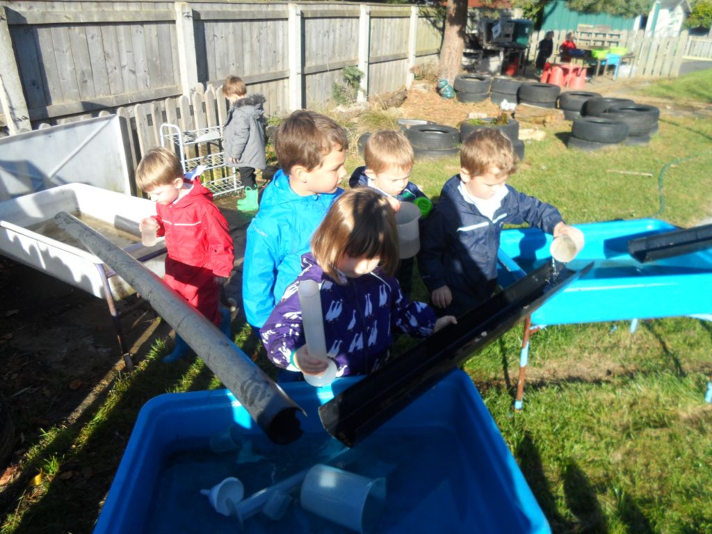We had some really super thinking skills on display in our outdoor water area. We were trying to get the ducks from the top water tray all the way to the bottom water tray.