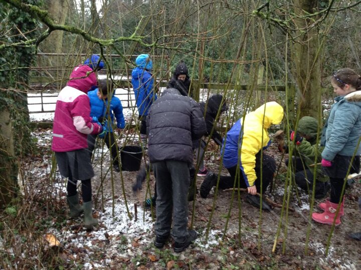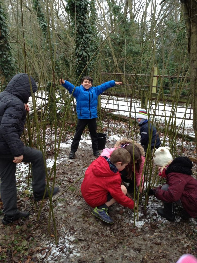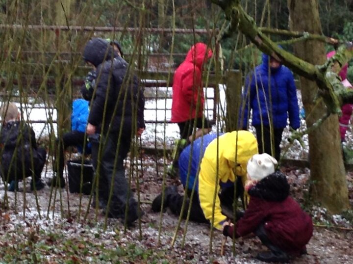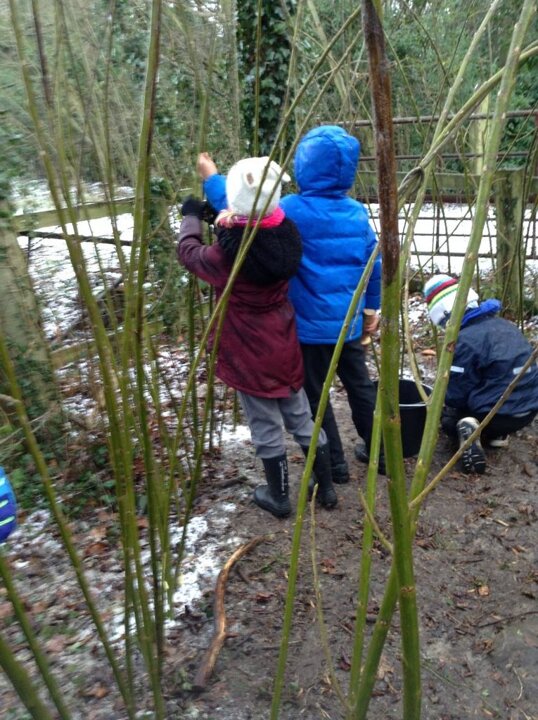This week, we battled against the snow and frost to add to our willow den. Our hands were getting cold and the ground was too hard to bang pegs in! We had a go though!