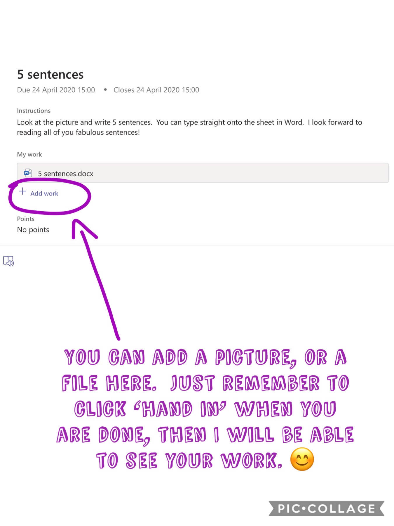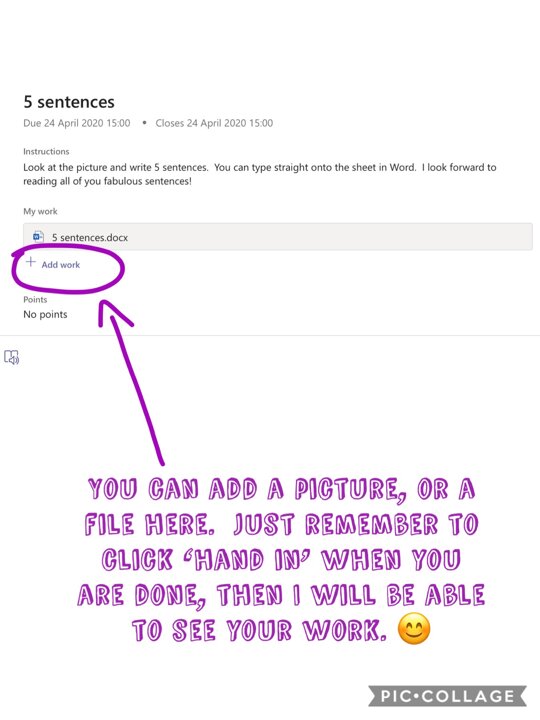 To upload work for an assignment (a document, a file, a picture, etc.) you can do so by choosing your assignment and then clicking on the ‘+add work’ button. You can then choose to add your work, from wherever you have saved it, and then click ‘hand in’.