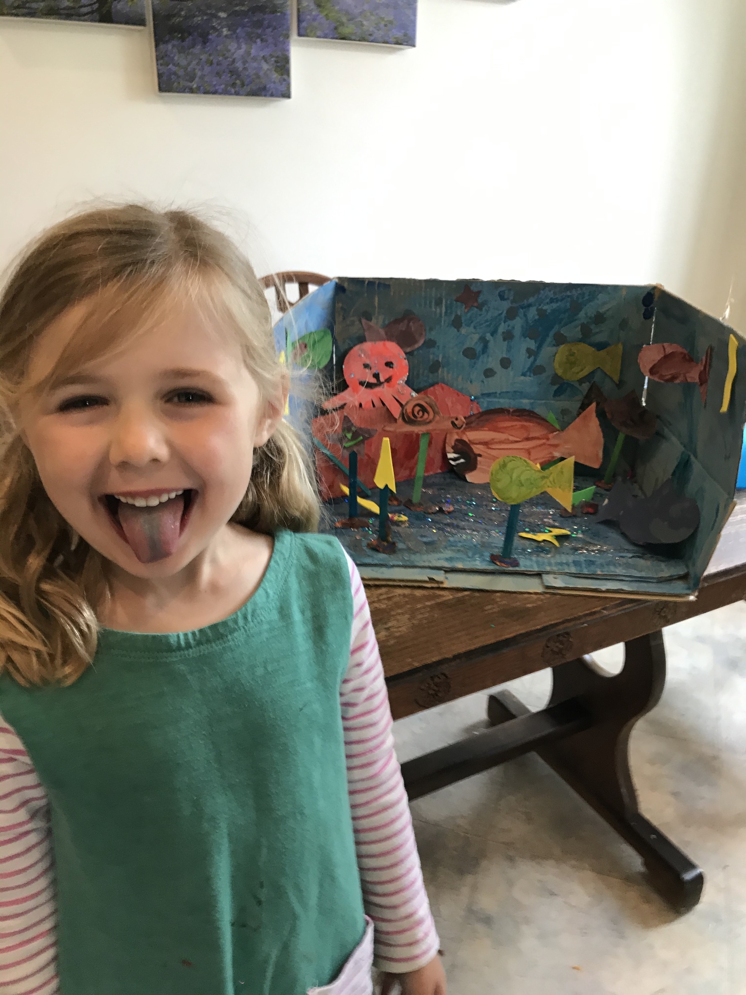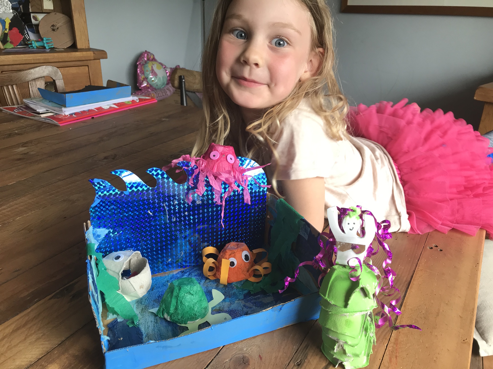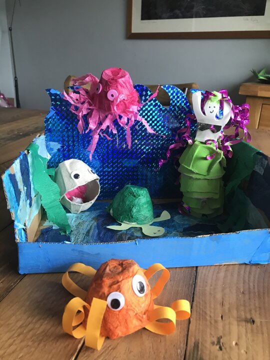 Take a look at this beautiful junk model whale which has been created as part of our Under the Sea Topic. I am extremely impressed with the design sheet that accompanies this super cute model. How about these fabulous Dioramas and wonderful mermaid and sea creature models too. I am sure they love living and playing in these fabulous underwater worlds. I think someone might be turning into an underwater creature. Can you see a little green tongue? Arrrrggghhh!