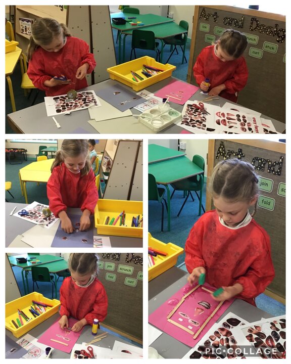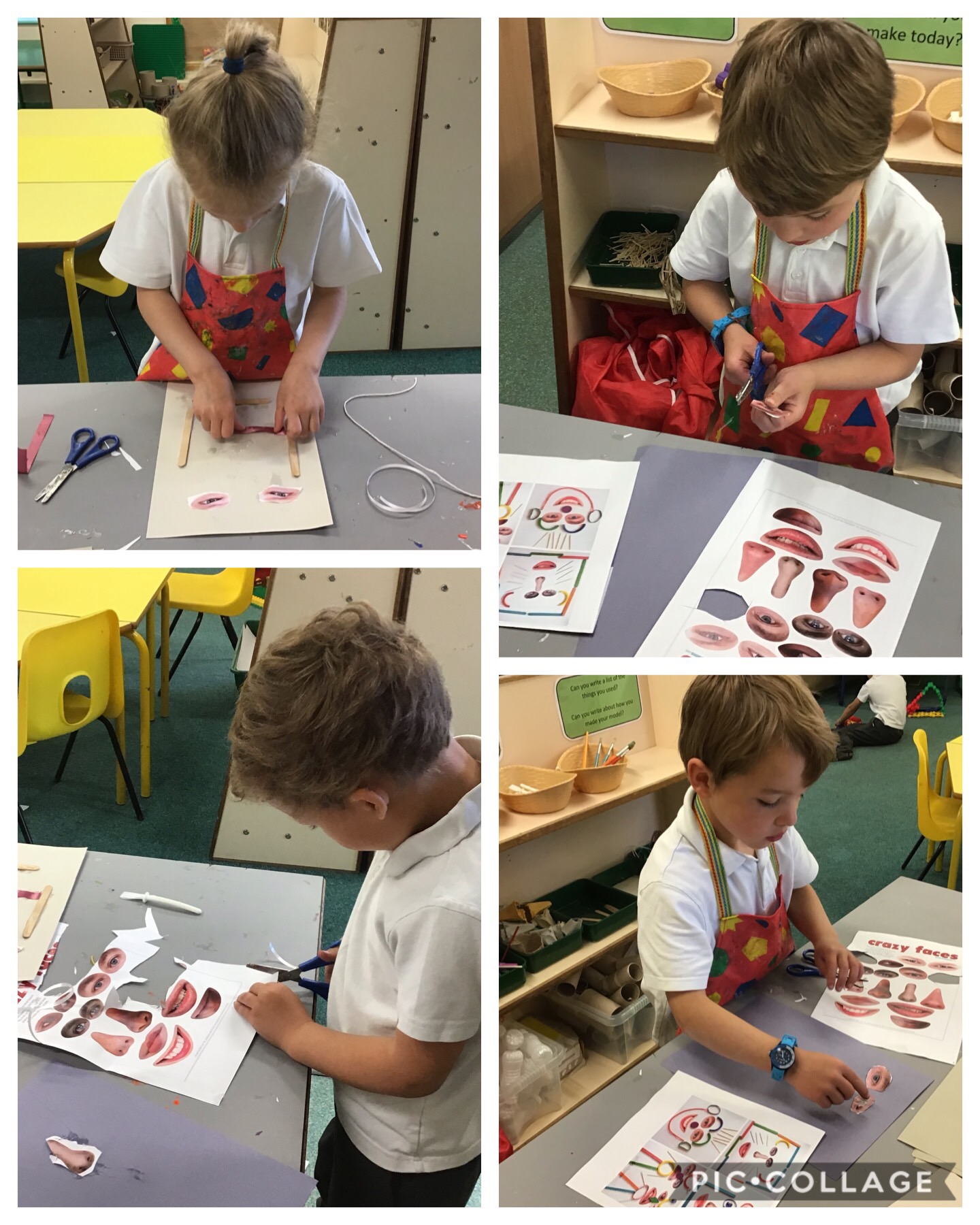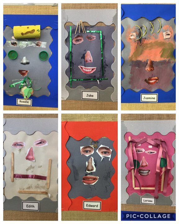 In the Design Area we had a go at making our own Emotions Portraits using lots of different materials and cutting out real facial features. We noticed that when you turn a smile upside down it made the face look sad and sometimes angry.