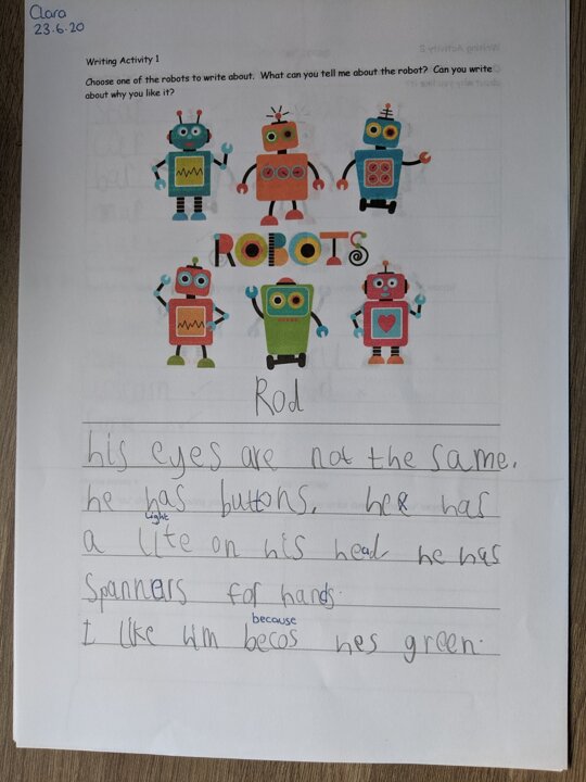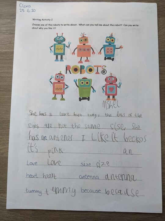 Today as part of our Robot topic some of us have been creating our own robots using different pieces of metal from the Transient Art Tray and using shapes from the Number Area. Don't they look fabulous. I also received some fabulous work from one of our busy bees working from home. We seem to be enjoying this topic so far.