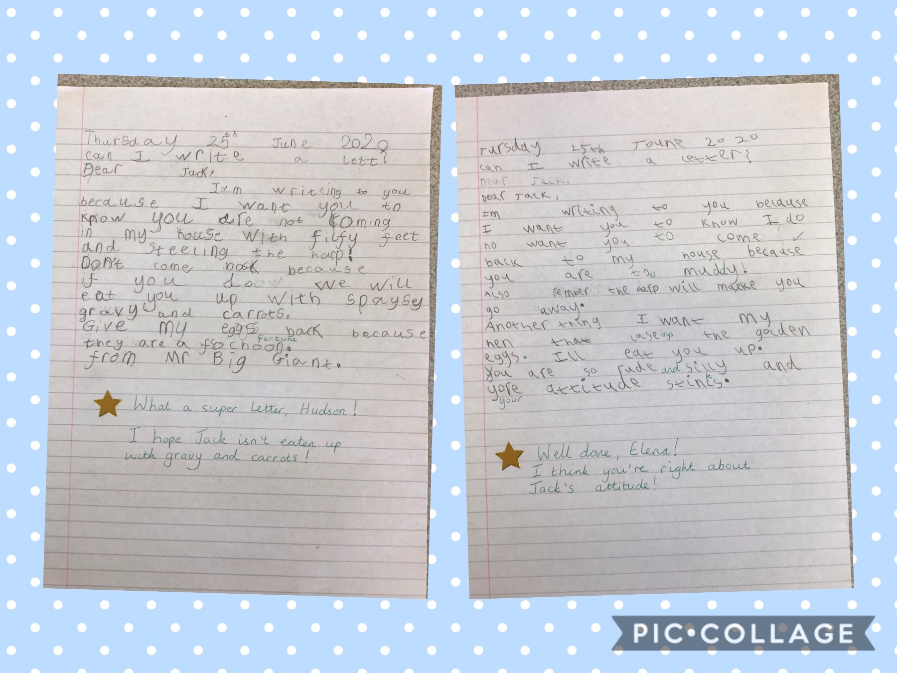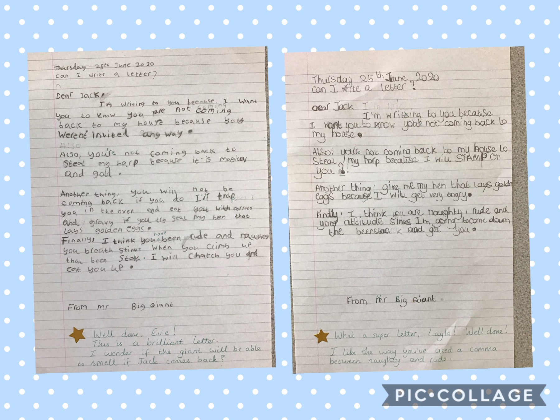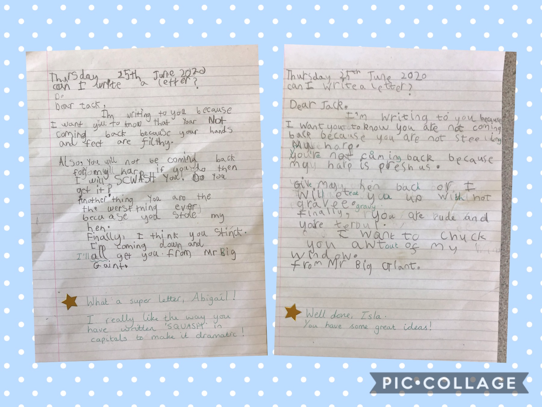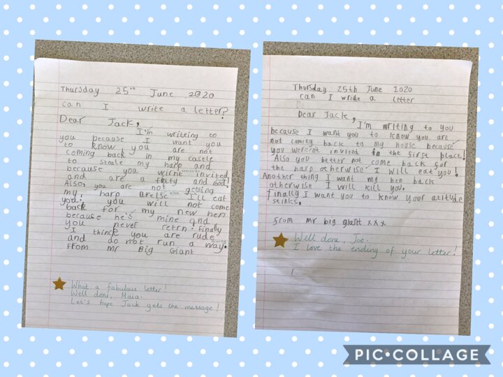 Today, the Year 1 children have written reply letters from Mr Giant Big, to Jack. They have told Jack exactly what they think of him, and what will happen if he tries to come back for the giant’s magical harp!