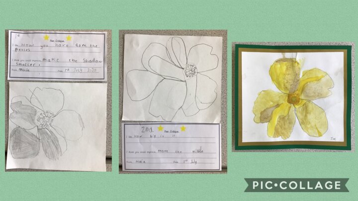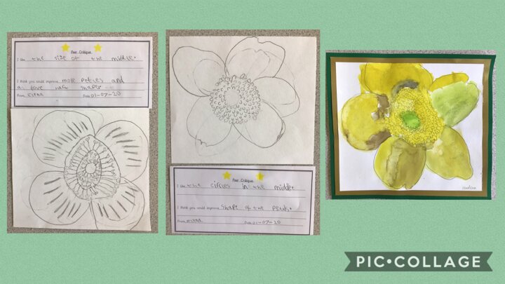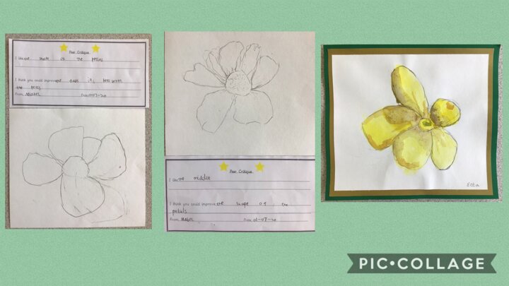 This week, the Year 1 children have been practising drawing realistically. They drew a buttercup, and then peer critiqued each other’s work. They then acted upon their feedback, and created another draft. Next, they did one more peer critique and created their final, watercolour artwork. We were all amazed and impressed with the difference and progress between the 1st drafts, and the final artwork! Well done everyone!