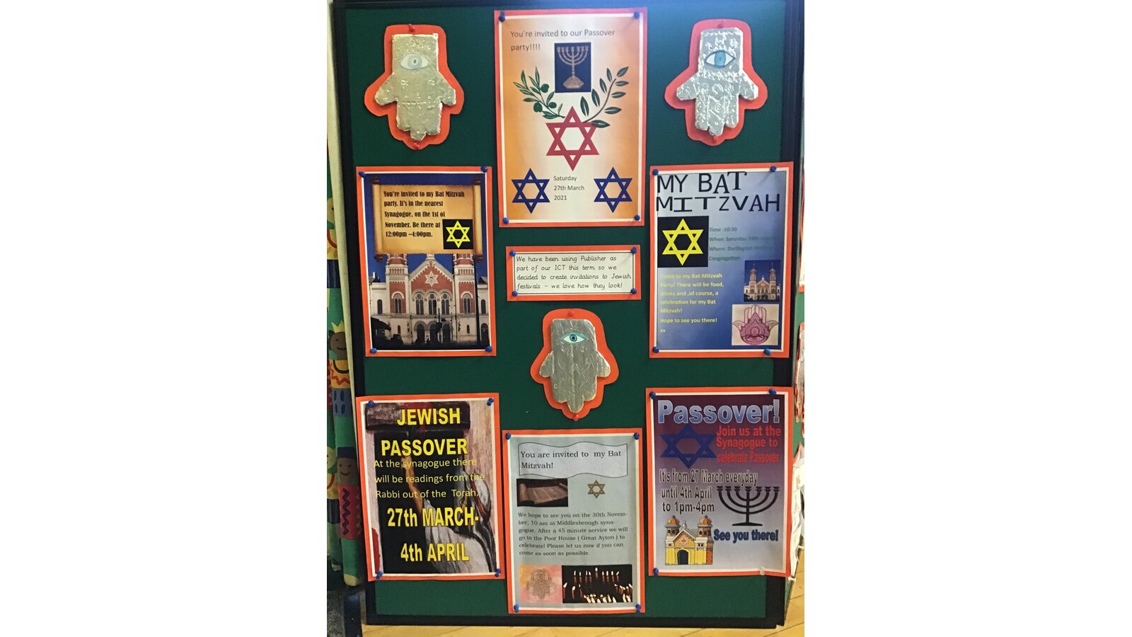 Wow! What an amazing week of learning we have had! We have been studying Judaism. We found out all about the Passover and produced some beautiful factual writing. We looked at Jewish symbols and presented them in an exploding book. We also printed the symbols in our own designs. We made some Matzah bread and found out all about the 10 Commandments. We researched Hamsa hands and that they are a sign of protection and a defence against the evil eye - then we made our own. Finally, we used our newly acquired skills using Publisher and created Jewish celebration invitations. Great learning everyone!