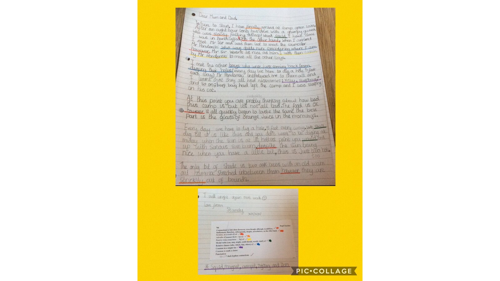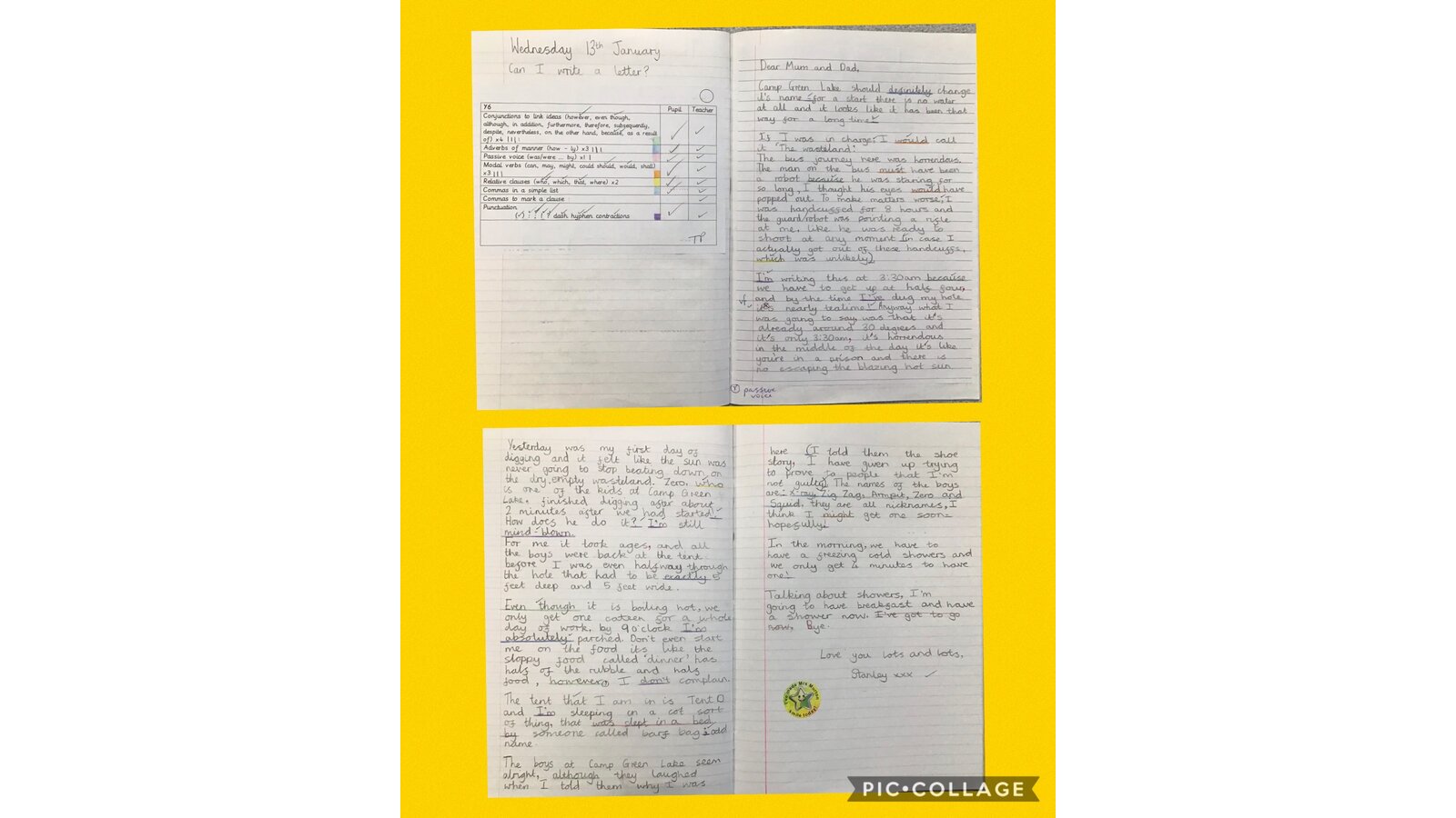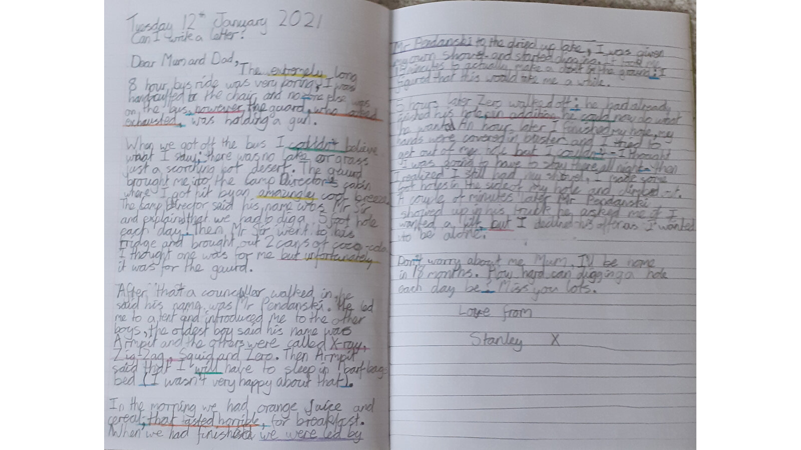 15 January 2021 Mrs Murton Year 6 2020 - 2021 This week in Literacy, we read some more of 'Holes' by Louis Sachar. The children pretended that they were Stanley Yelnats and wrote a letter home describing what it is like at Camp Green Lake. Previous Next