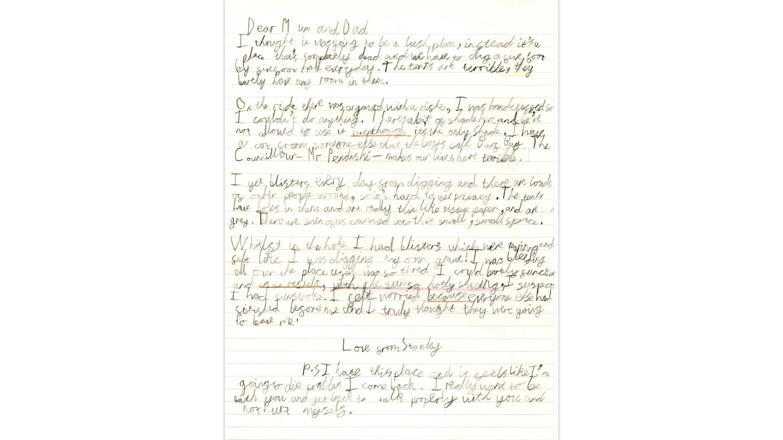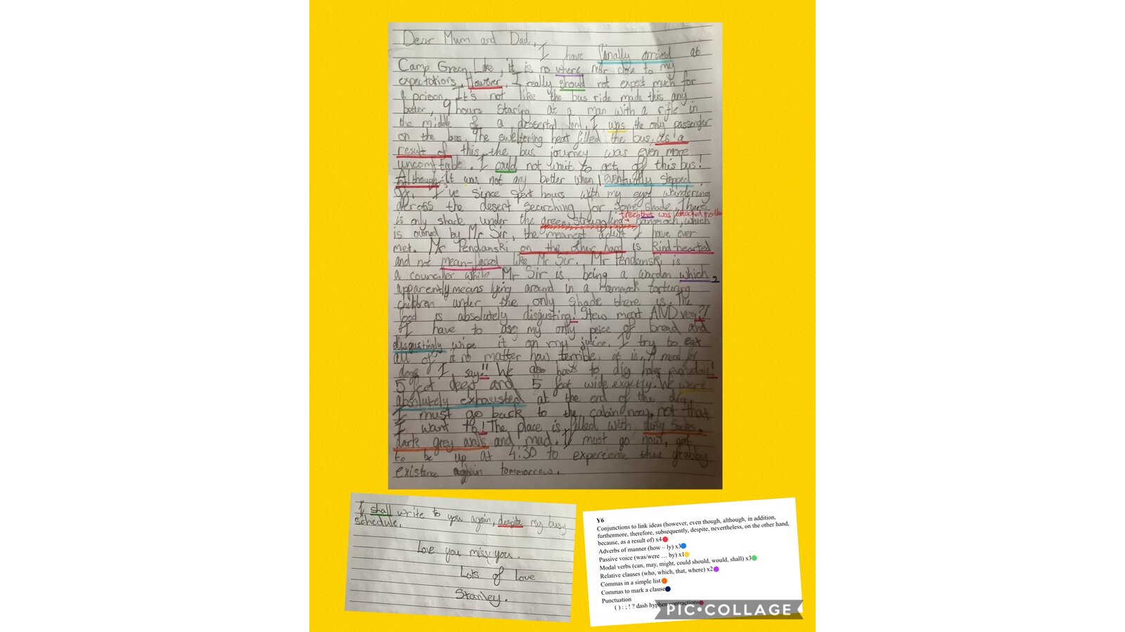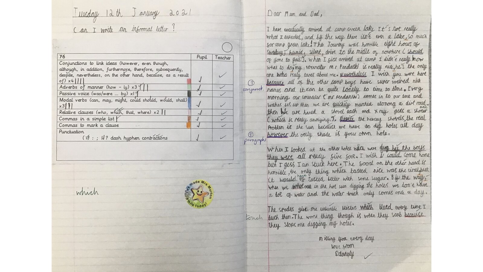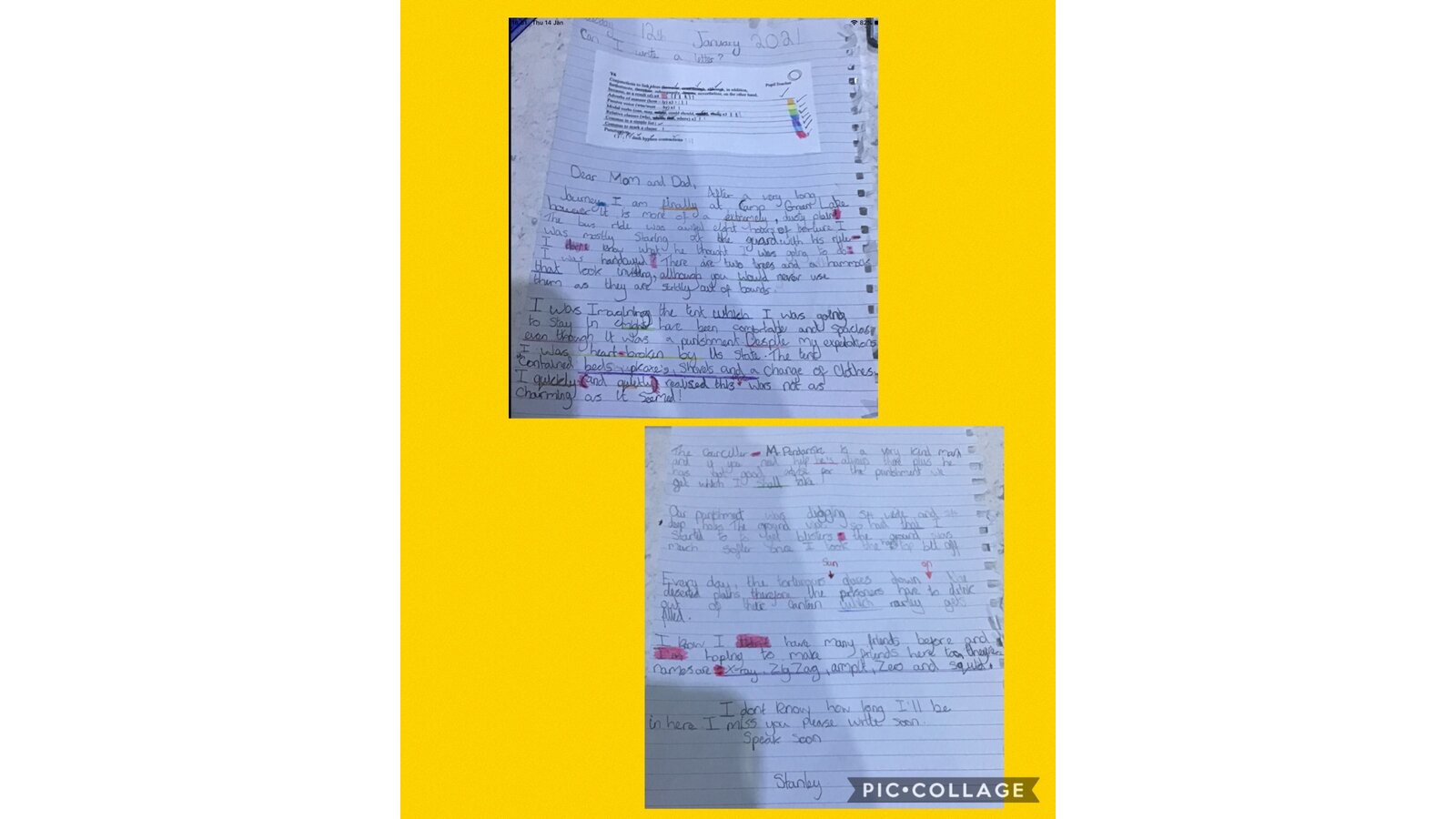 15 January 2021 Mrs Murton Year 6 2020 - 2021 This week in Literacy, we read some more of 'Holes' by Louis Sachar. The children pretended that they were Stanley Yelnats and wrote a letter home describing what it is like at Camp Green Lake. Previous Next