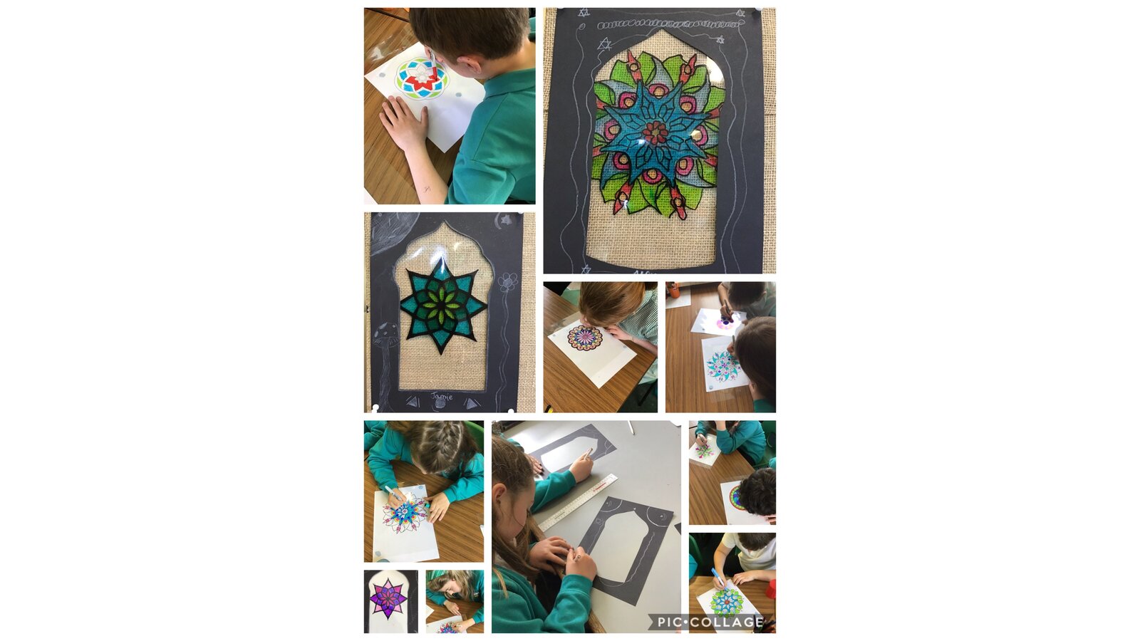 After learning lots of Islamic facts, the children created these stained-glass windows with geometric designs that are inspired by the Islamic ideal that geometric designs emphasise the infinite power of Allah. They worked really hard to intricately create their patterns.
