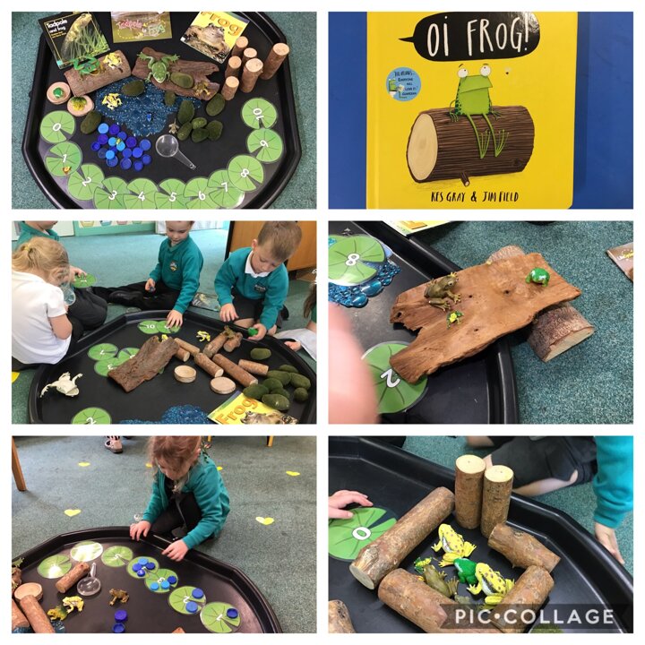 Using the different resources on the black tray, we enjoyed creating different places for the frogs to live, exploring the information books, ordering the numbered Lilly pads and counting out the correct number of water droplets.