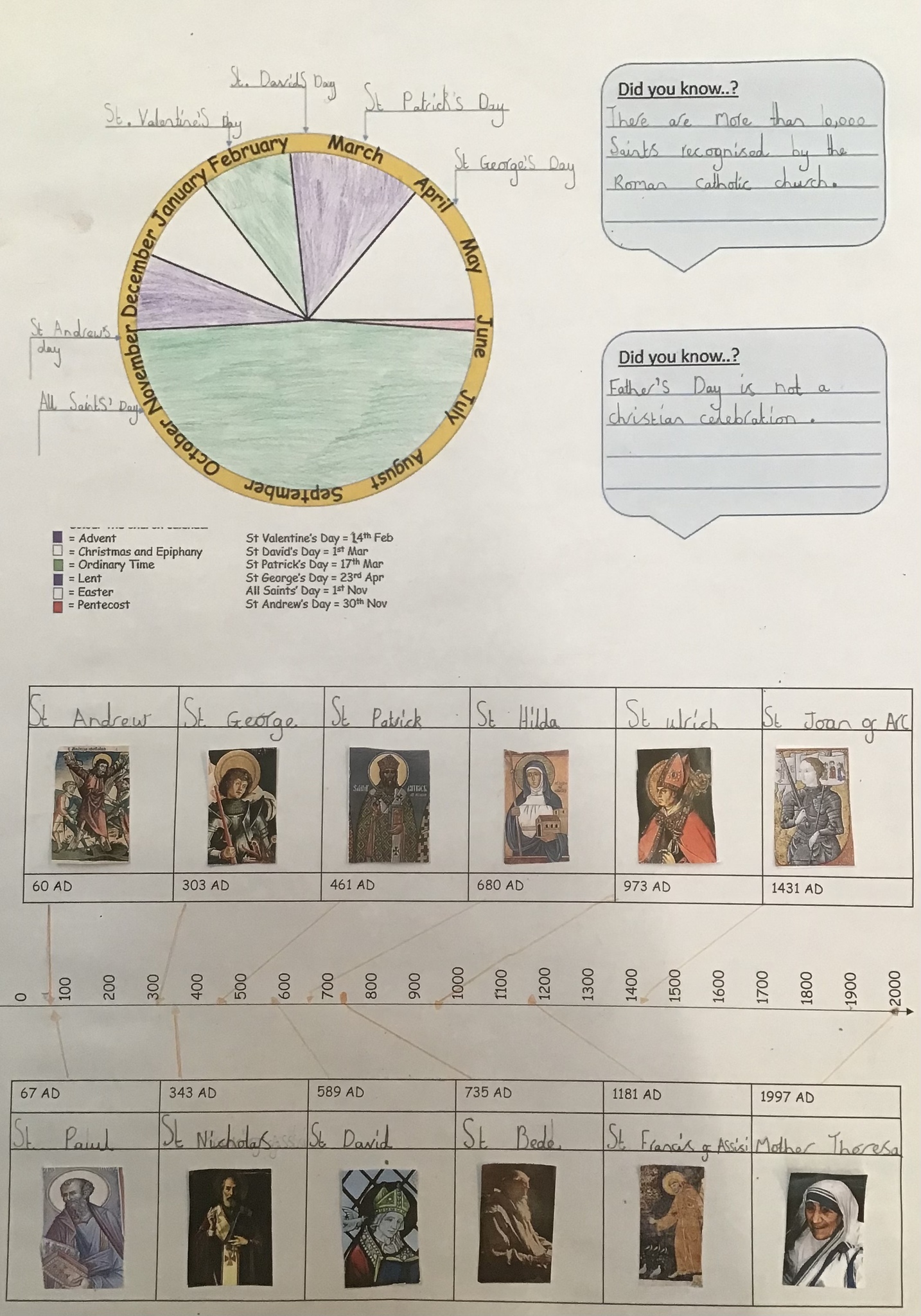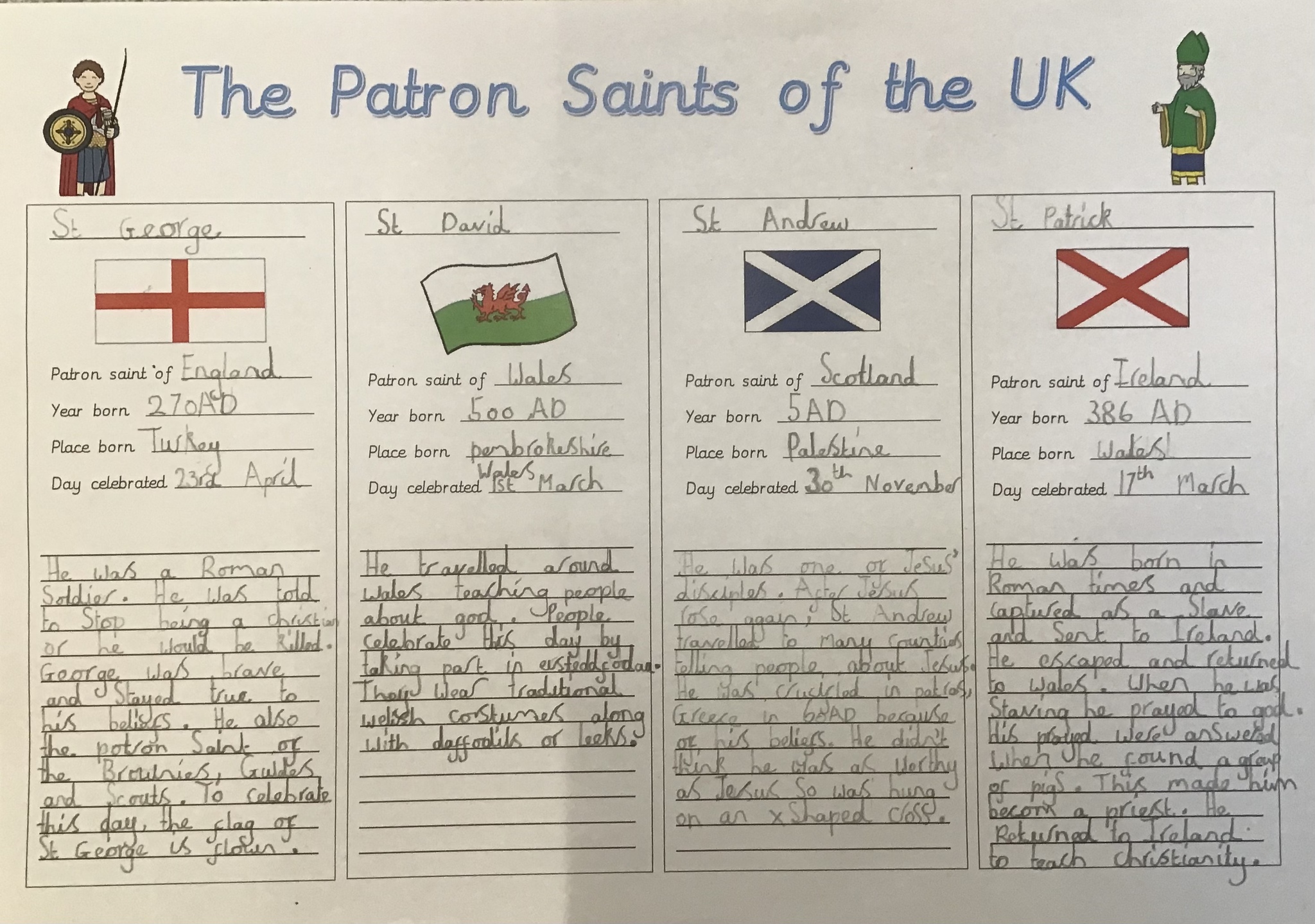This week we have been learning about Christian festivals focusing upon All Saints. We now know how to become a saint and created our own using oil pastels. Did you know that there are over 10,000 saints and that you have to be dead more than 5 years?! We looked at the Patron Saints and how their days are celebrated throughout the UK. We made collages of the flag of the United Kingdom - the Union Jack. We learned that it is made up of the flags of St George, St Andrew and St Patrick. We then told the story of St George and painted a picture showing the battle against the dragon. Have a look at some of our brilliant work.