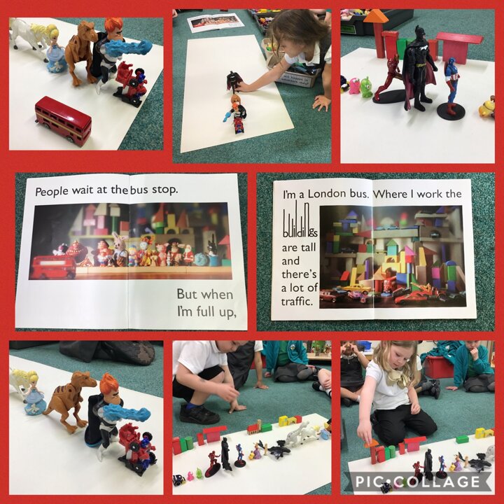 In the story, the Naughty Bus whizzed past the line of people waiting at the bus stop. We explored the words passenger and queue and talked about what these words mean. We re-recreated this part of the story using lots of different toys to make a queue and the small wooden blocks to build the city of London.